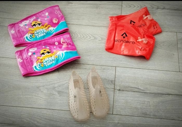 Lot d'articles pour la mer ou la piscine composé de : - Une paire de chaussures d'eau taille 27 - Une paire de brassards rose Arena motif pieuvre (3-6 ans / 18-30kg) - Une paire de brassards orange tecnopro (11 à 18kg). 🎉🎉🎉 Remise activée sur les lots 🎉🎉🎉
