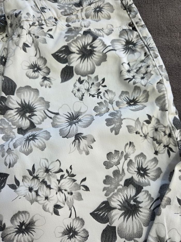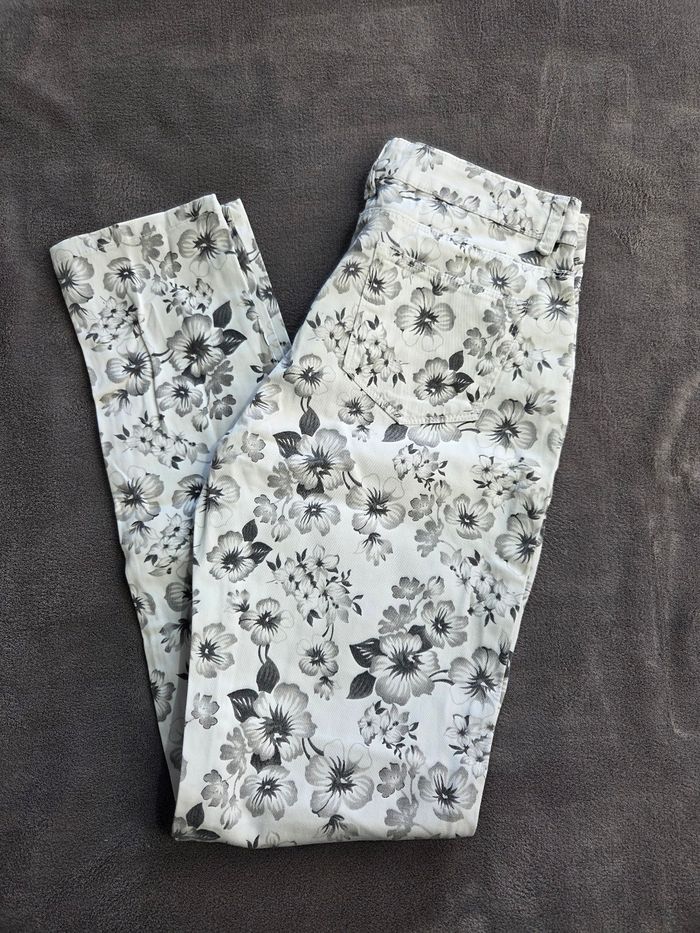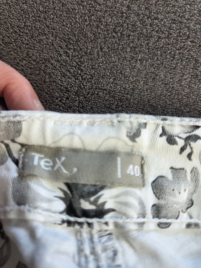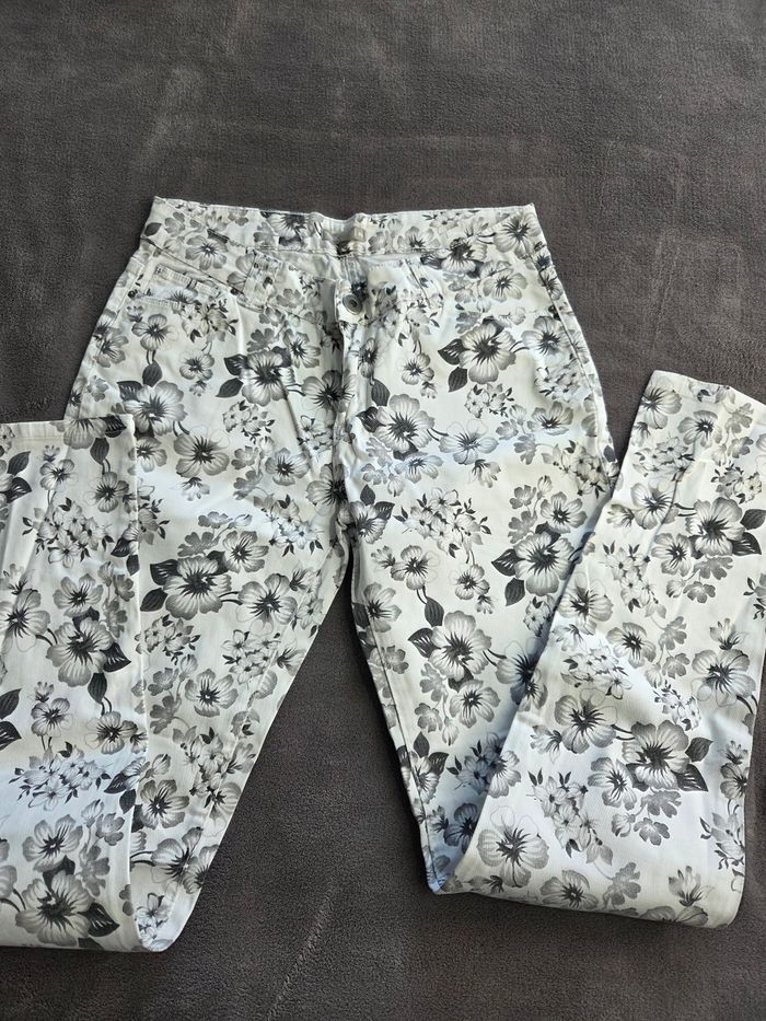 Pantalon blanc à motifs floraux noirs et gris, style élégant et original. Marque TEX. Taille 40 (voir étiquette). Matière confortable, agréable à porter au quotidien ou pour une tenue plus habillée. Bon état général. #pantalonfemme #taille40 #venterapide