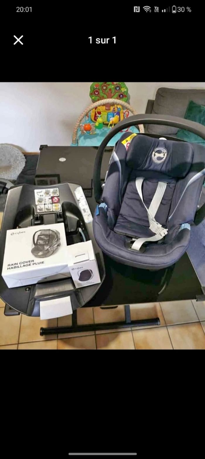 Je vends cet ensemble cosy, base isofix, habillage de pluie et moustiquaire de marque cybex.