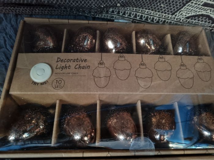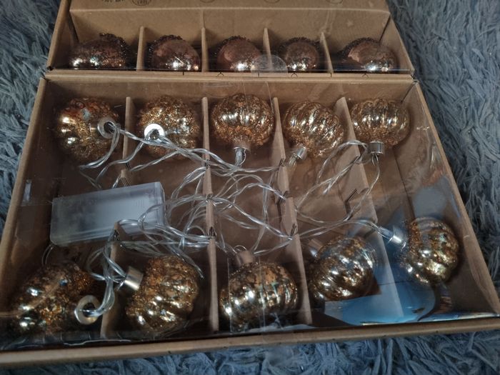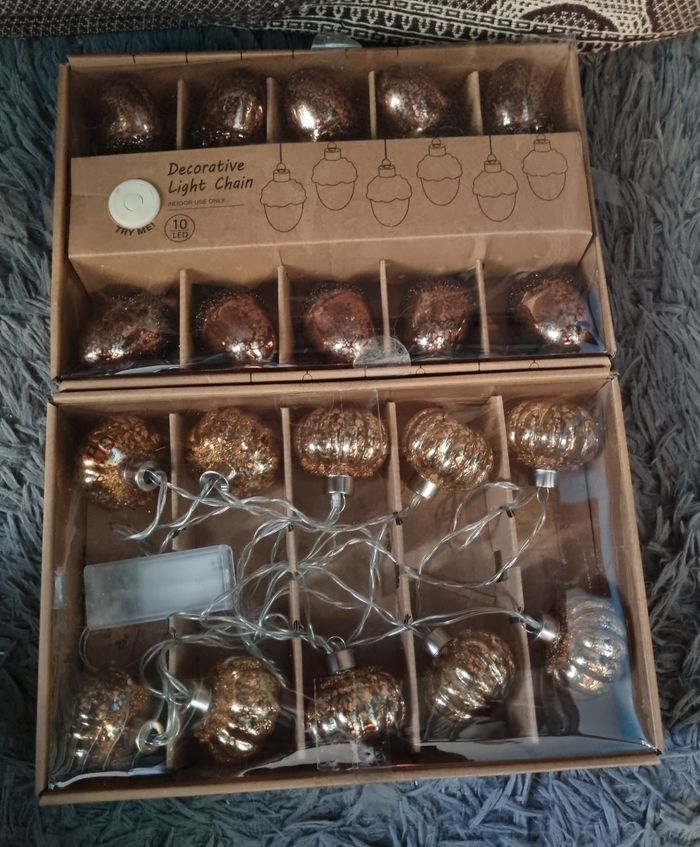 Lot 2 guirlandes d'automne (gland et citrouille) en verre, couleur blanc chaud, fonctionne à piles, dimensions en photos sur les boîtes.