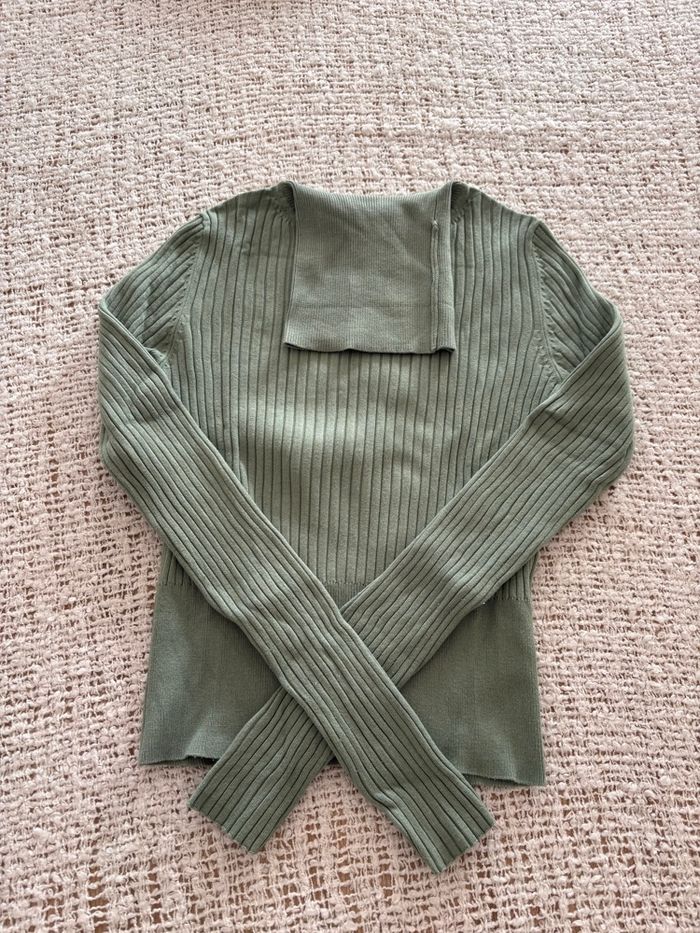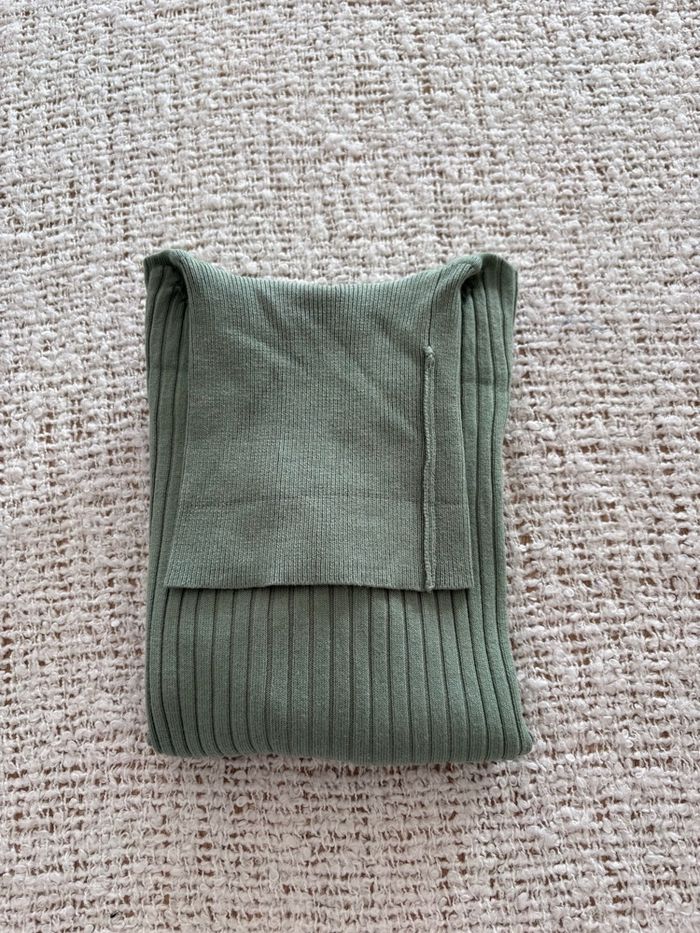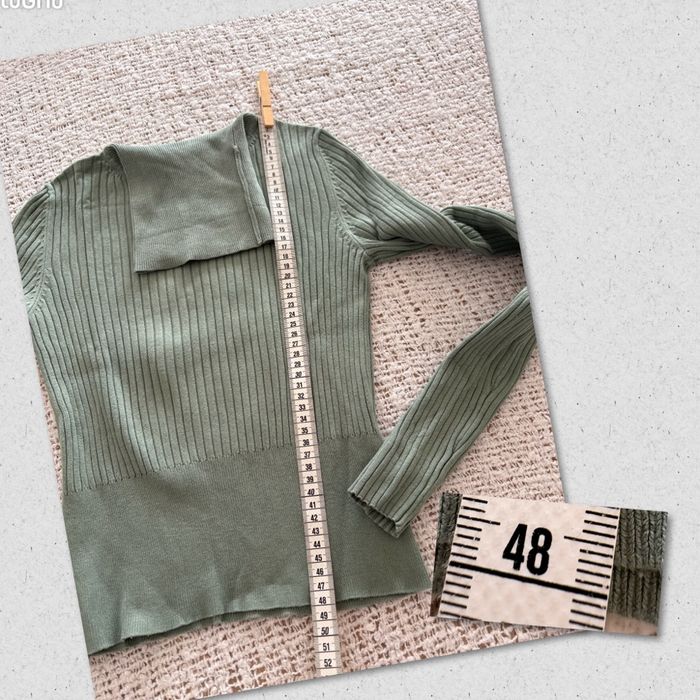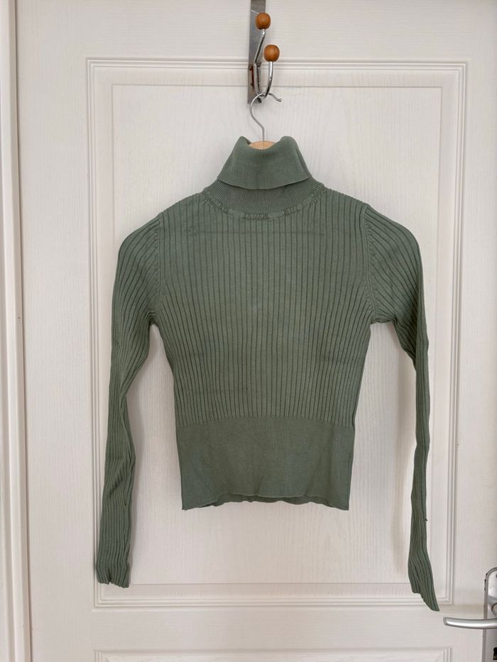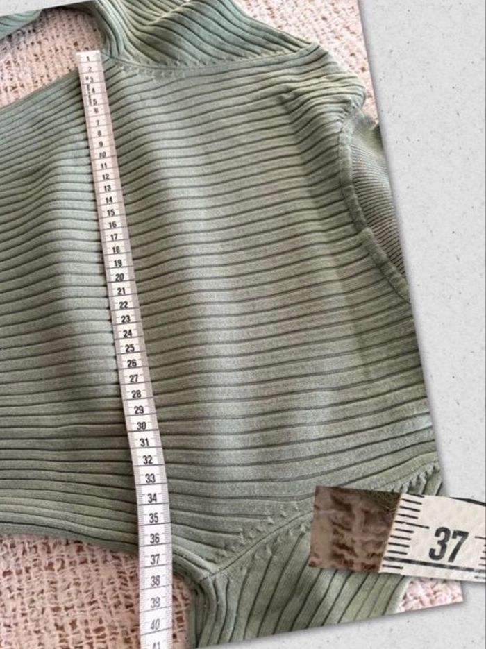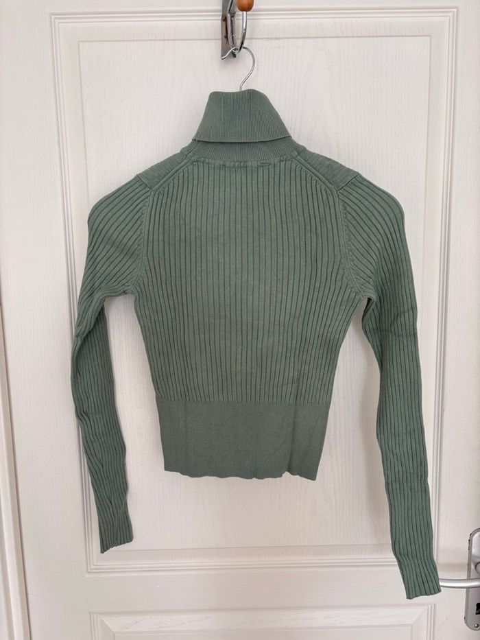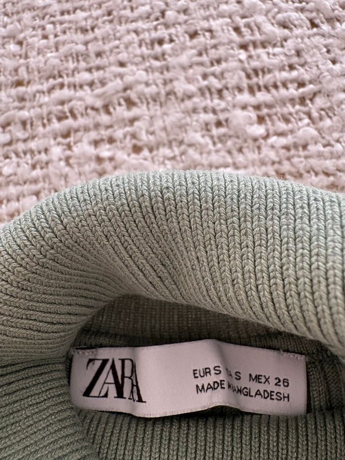 Tricot col roulé « Zara » vert amande marqué en taille S mais conviendra mieux pour une taille XS Largeur épaule 32 cm Largeur prise sous les aisselles 37 cm Longueur 48 cm