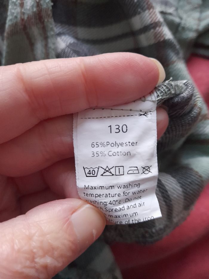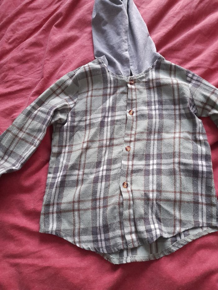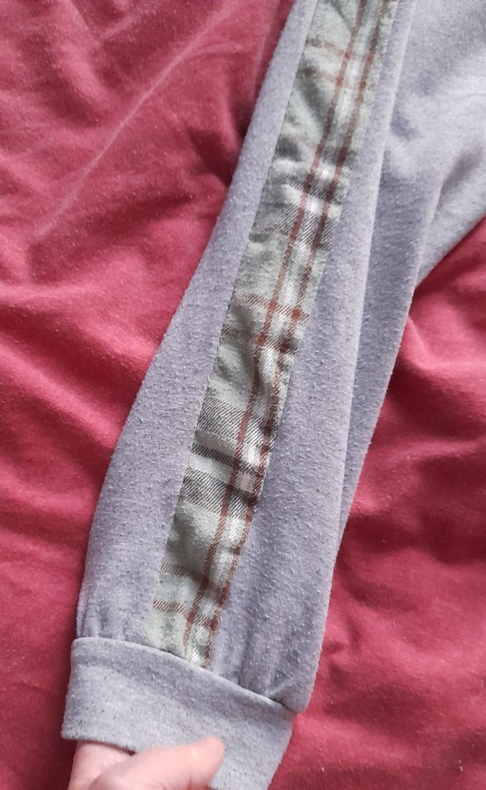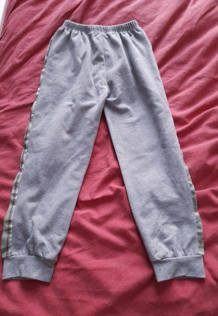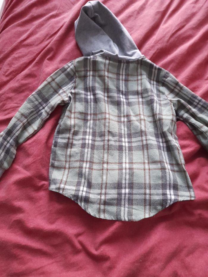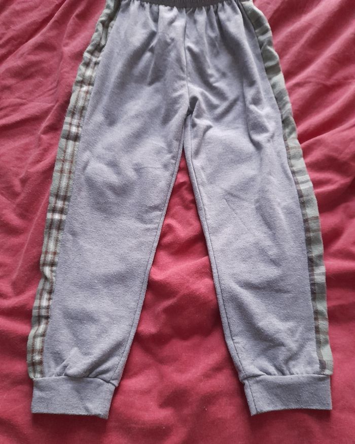 Ensemble molleton 3 pièces comprenant une chemise manches longues à carreaux vert avec capuche Un t-shirt manches longues blanc et un pantalon gris bandes verte sur le côté. Indiqué taille 130 mais correspond plus à un 7ans.
