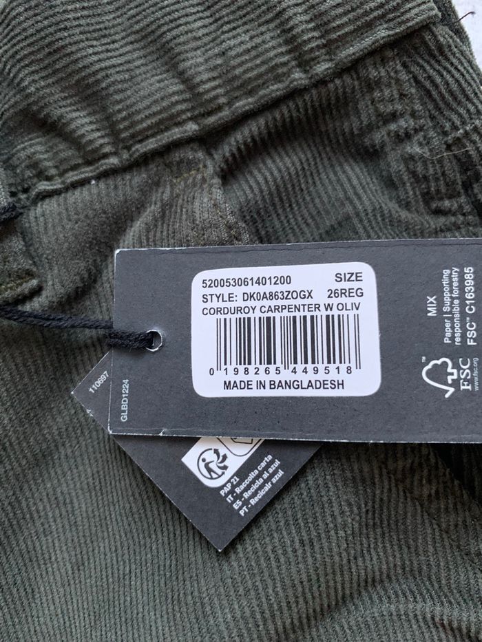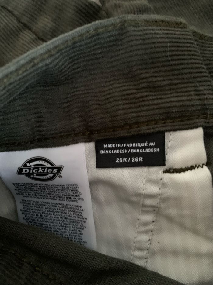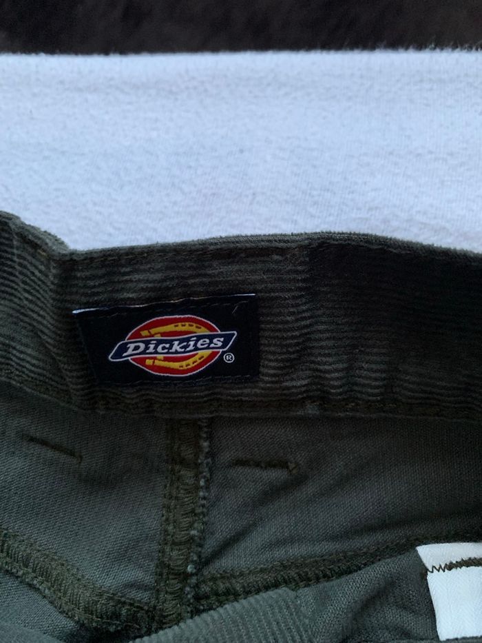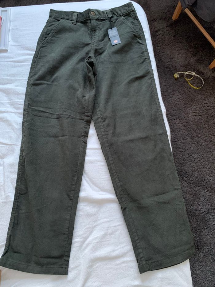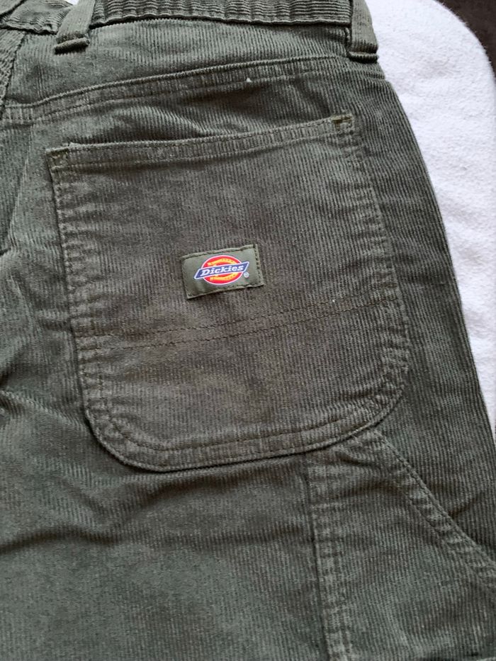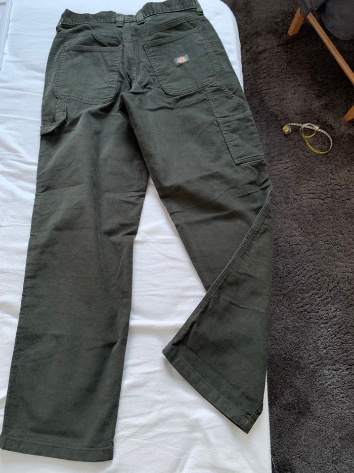 Dickies - Pantalon charpentier ample en velours côtelé - Vert olive Taille mi-haute Passants pour ceinture Poches latérales et arrière Poches cargo Logo Large En velours côtelé Composition : 100 % coton. Taille 26 ce qui équivaut à un 36
