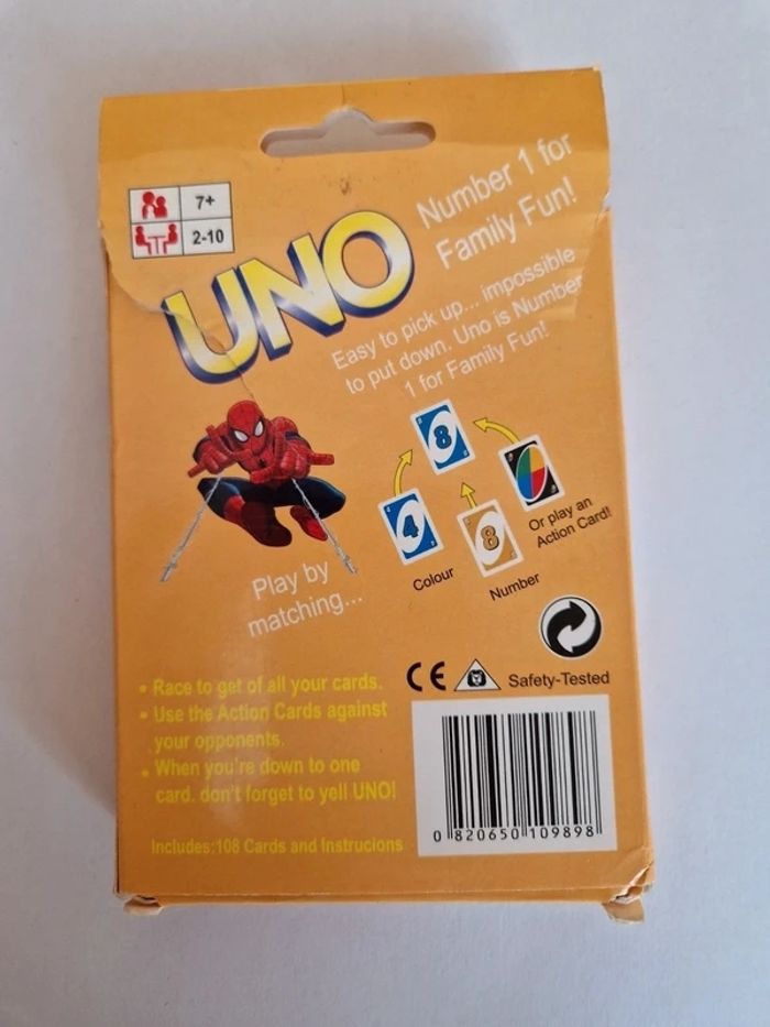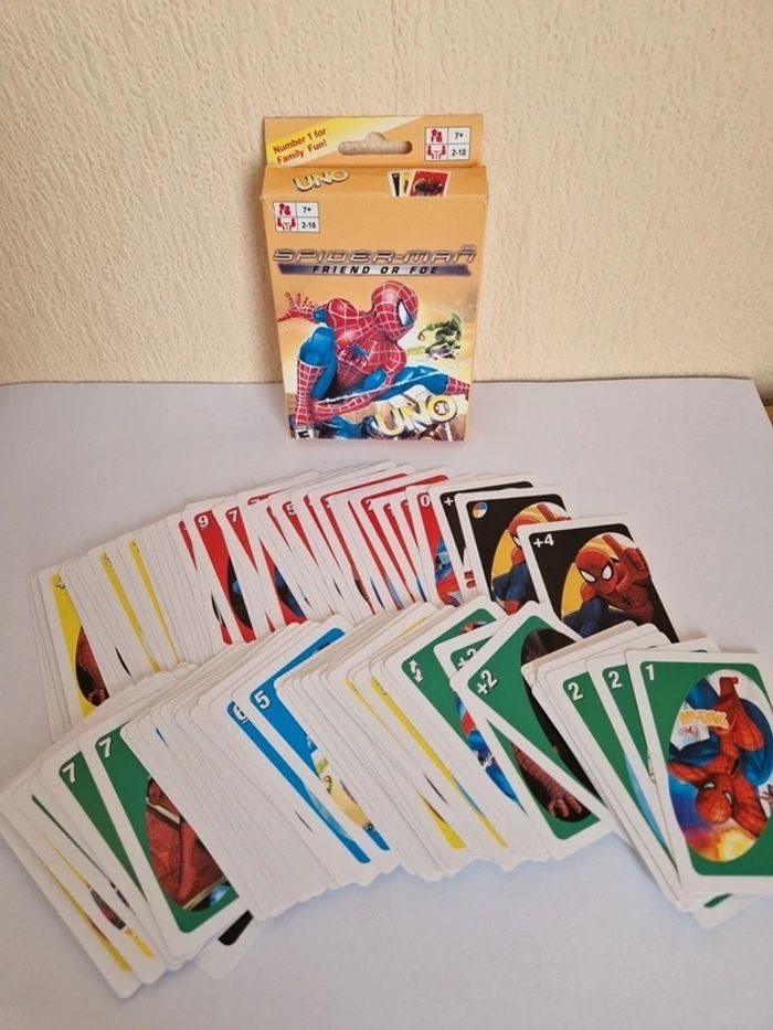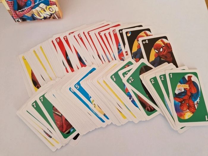 Jeu Uno Spiderman. 100 % complet. Cartes en très bon état! Boite abimée sur un côté voir dernière photo.