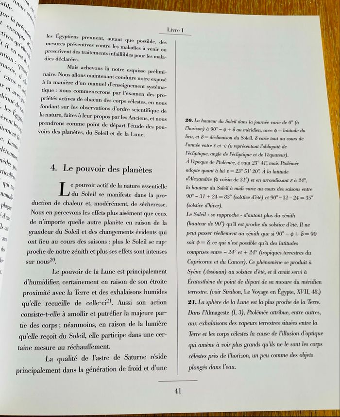 Le livre unique de l'astrologie Astrologie mondiale et thèmes de naissance Ptolémée Nil Éditions 2000 Couverture souple 274 pages TBE Ptolémée fut à l'astronomie, à la géographie et à la musique ce qu'Archimède fut à la physique et Platon à la philosophie. Mais ce génial savant se passionna aussi pour l'astrologie, une pratique qui, au IIe siècle après J.-C., consistait essentiellement à enregistrer les configurations célestes et les prévisions que l'expérience avait permis de leur associer. Ptolémée, le premier, fit de ces connaissances foisonnantes un savoir. Son ouvrage, considéré depuis comme la bible de l'astrologie, en pose les principes et les règles avec une clarté et une rigueur jamais égalées et expose ses instruments essentiels ainsi que les domaines qu'elle concerne : la vie quotidienne des individus - le tempérament, les maladies, la richesse, les voyages -, comme les caractères des peuples. Traduit pour la première fois dans son intégralité à partir de l'original grec, ce texte fondateur de l'astrologie occidentale est éclairé par le regard croisé de trois éminents spécialistes : un helléniste, un astronome et un astrologue, offrant au lecteur averti ou simplement curieux à la fois un traité et une véritable encyclopédie dans le style accessible à tous voulu par son auteur. Ce livre unique et passionnant, où l'astronome et l'astrologue parlent d'une même voix, met fin au procès intenté depuis des siècles à l'astrologie par les rationalistes purs et durs.p