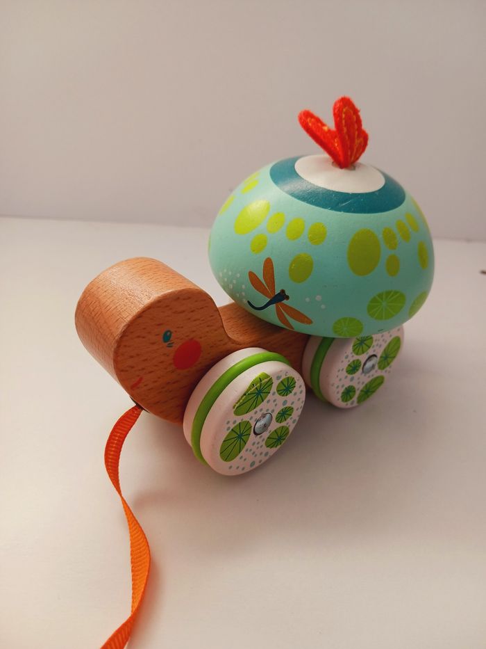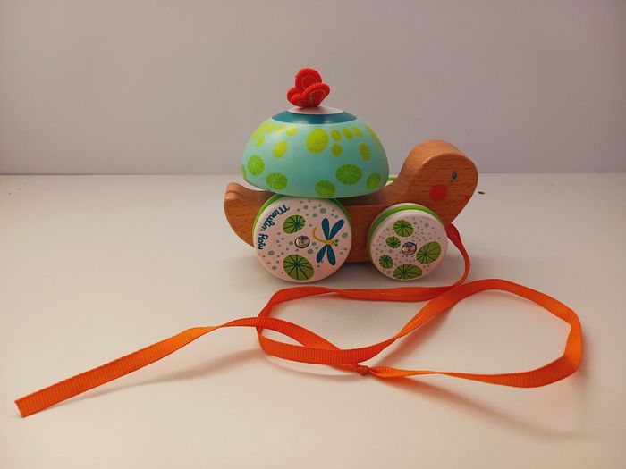 En très bon etat La carapace tourne lorsque la tortue avance Très mignon En bois