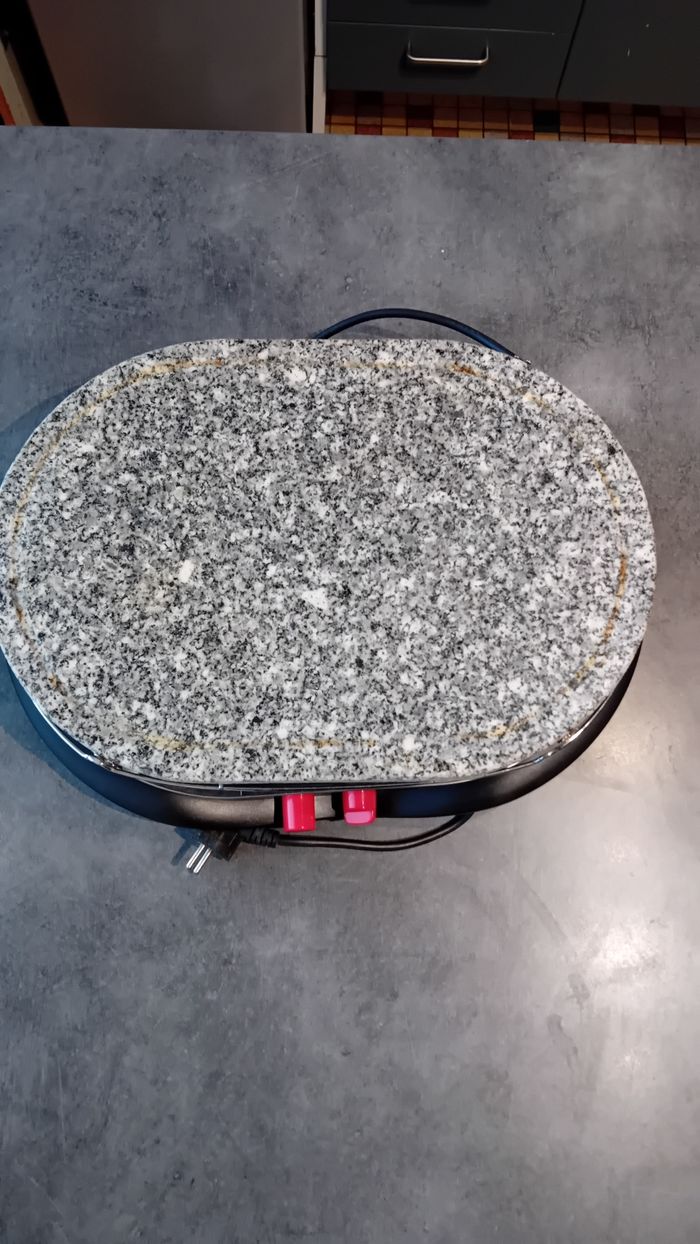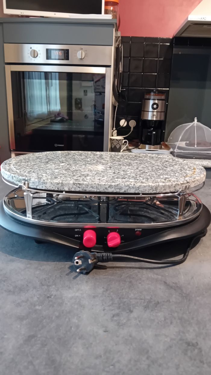 Vends appareil 3 en 1 : raclette, pierrade et mini crêpe Utilisé 1 ou 2 fois car nous en avons un autre. Pierre à pierrade en veritable pierre de granit 8 poêlon à raclette Plaque à mini crêpe neuve, jamais utilisée.