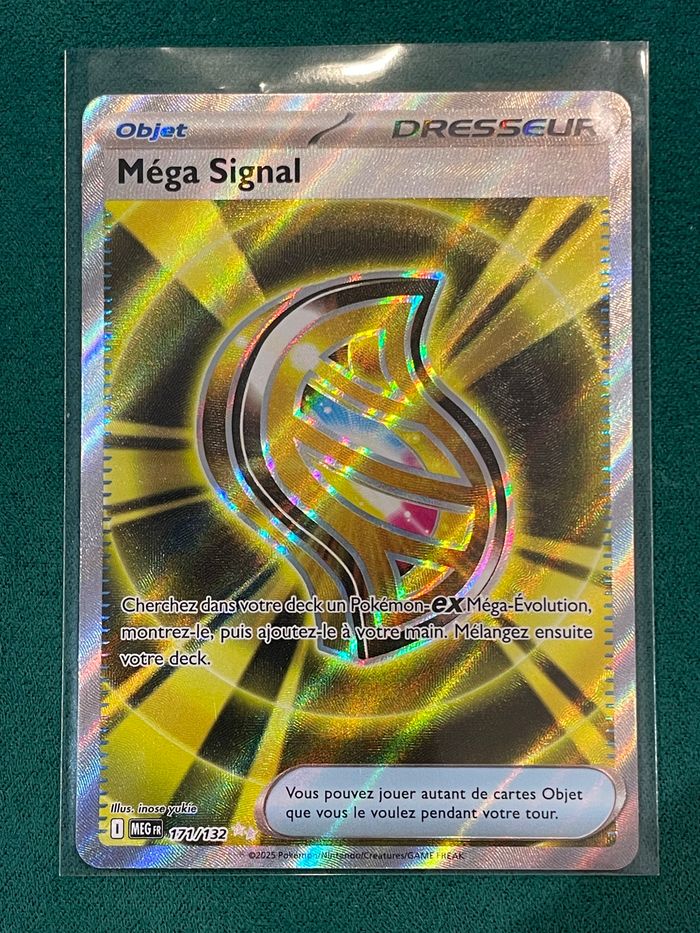Méga Signal - MEG 171/132 - Méga-évolution en Français Carte officielle, issue directement de booster. État : Near Mint (NM) Produit authentique et certifié officiel Pokémon. Possible défaut d'usine (points blancs, point blanc de coupe, etc …) Envoi rapide & soigné.