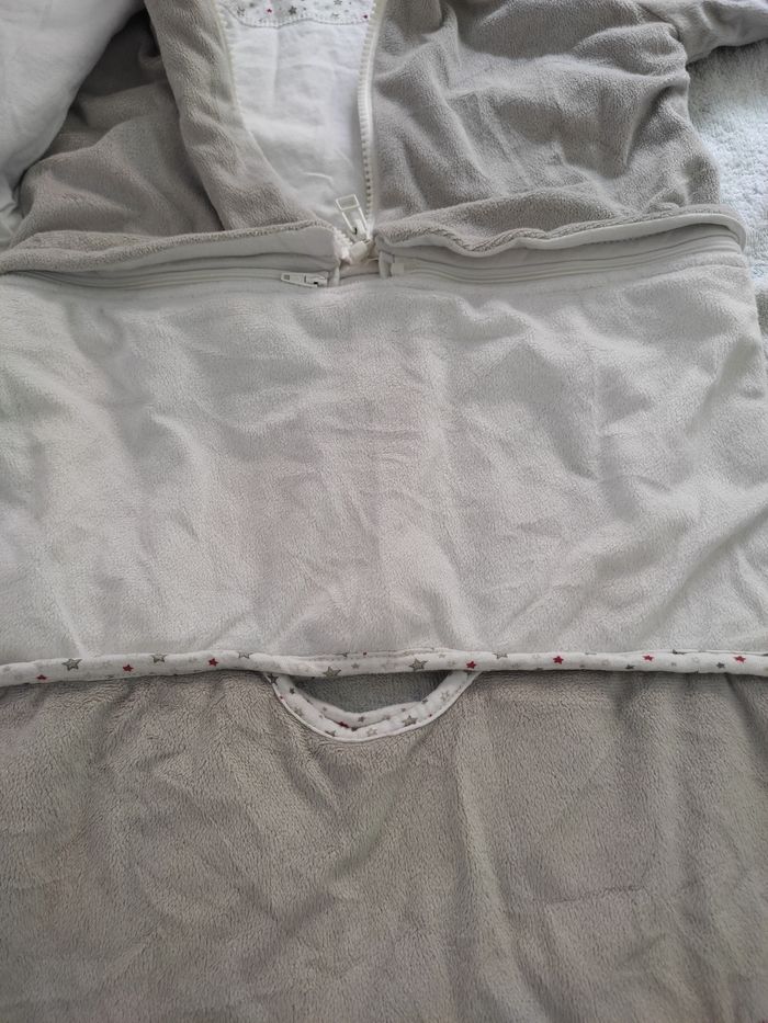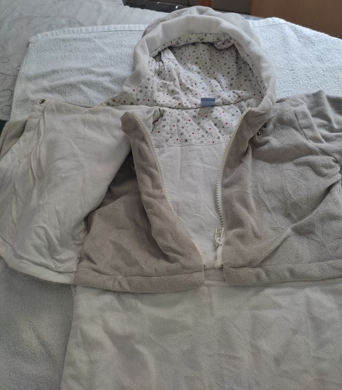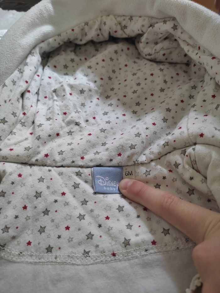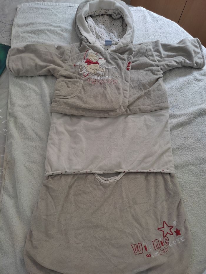 Combinaison Disney grise et crème motif Winnie.6 mois.Se sépare avec fermeture éclair pour utiliser que le haut.Le haut fait veste, confortable.(voir photo)Muni d un trou pour passer l attache de la ceinture.(voir photo). légèrement jauni mais c'est à l intérieur.(voir photo).Bon état.