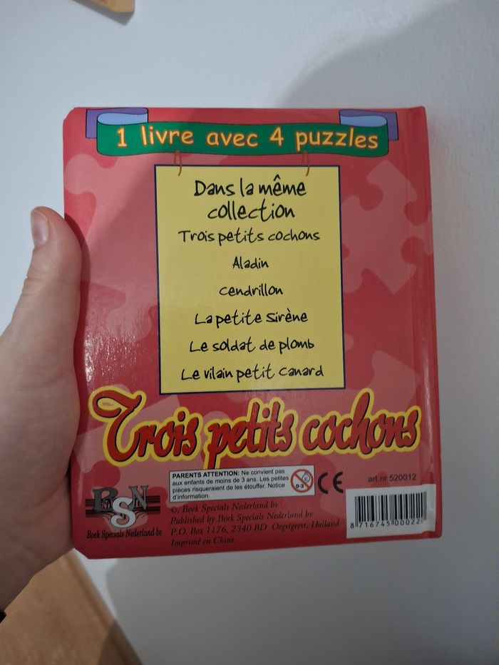 Je vends un livre-puzzle pour enfant sur le célèbre conte “Les Trois Petits Cochons”. 📘 Détails du produit : 1 livre avec 4 puzzles intégrés Illustrations colorées et attractives Favorise la motricité fine, la logique et l’éveil Idéal pour les jeunes enfants / âge maternelle Format solide, adapté aux petites mains 📌 État : très bon état Livre-puzzle complet, puzzles présents et en très bon état. Aucune pièce manquante, livre propre et bien conservé. 📬 Envoi rapide et soigné #livrepuzzle #puzzleenfant #livreenfant #jeuenfant #eveil #motricitefine #contes #troispetitscochons #jeunesse #tresbonetat #ideecadeau