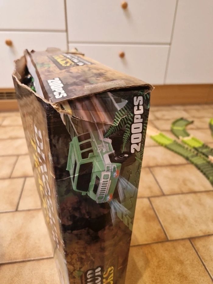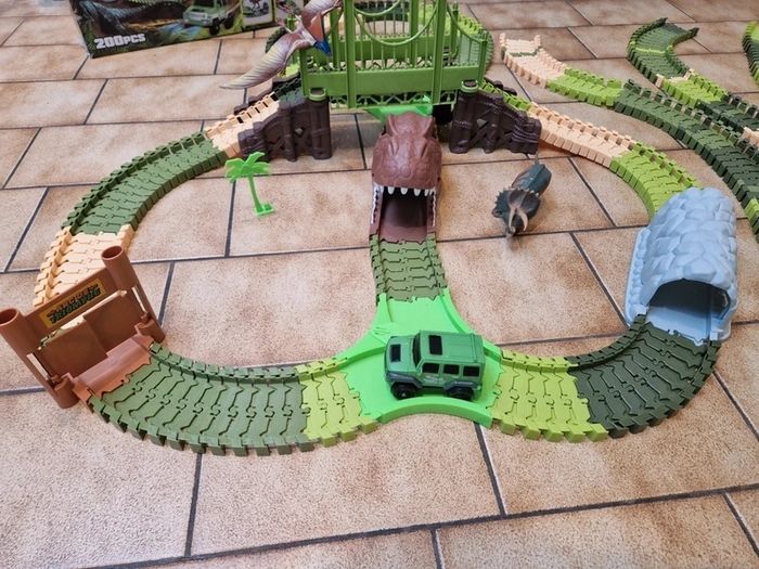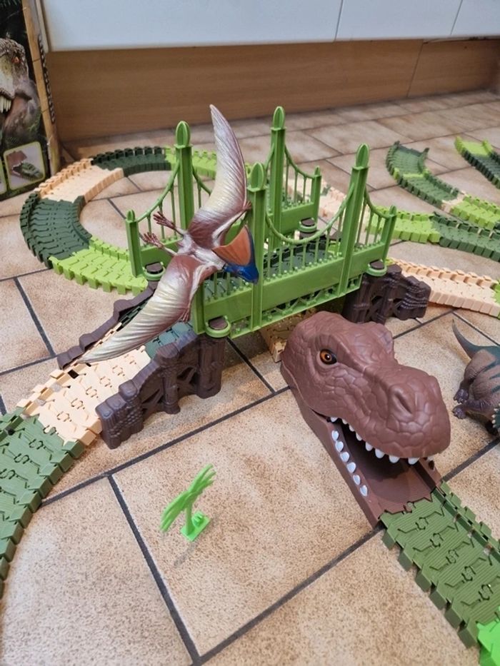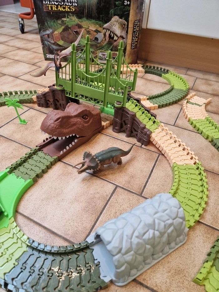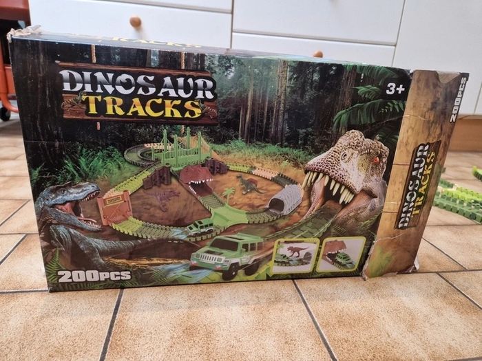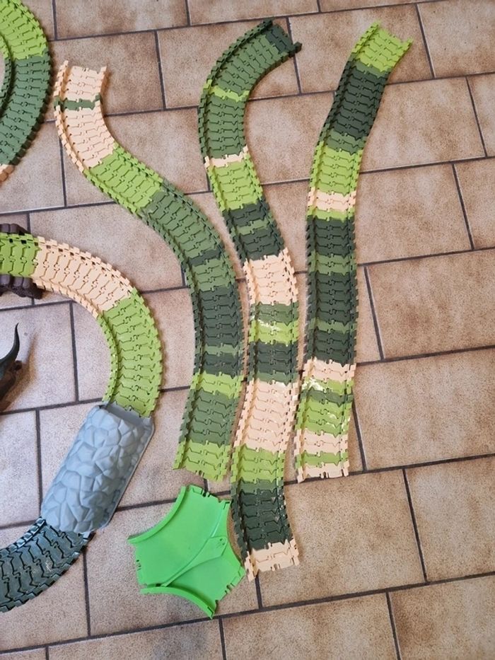 Circuit flexible Dinosaur Tracks avec rails et aiguillage supplémentaires. Le Circuit Dinosaur Tracks ( Circuit monté sur la photo est quasi complet, 197 pièces/ 200, il manque un arbre de décoration et deux dinosaures). La voiture fonctionne parfaitement mais il faudra remettre des piles neuves 😉. Au lot de départ, est rajouté un peu plus de 160 rails et un aiguillage. J'ai également rajouter 2 dinosaures. Boite abimée voir photos sinon le reste est en excellent état! Prix pour l'ensemble.