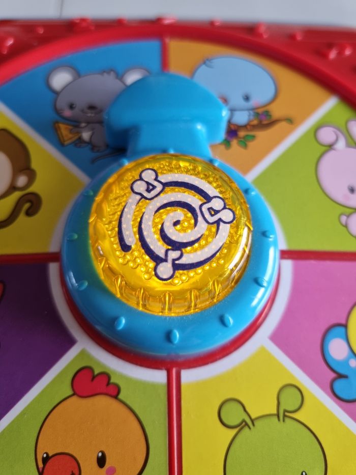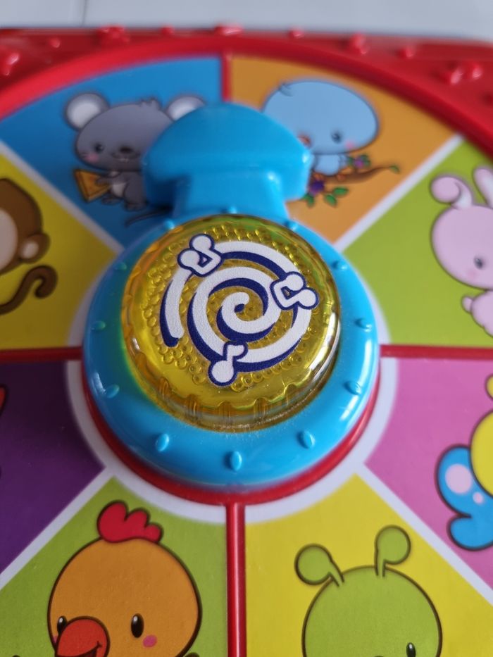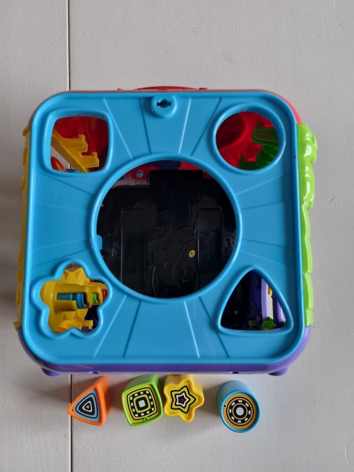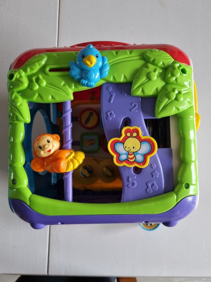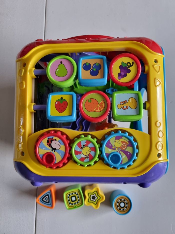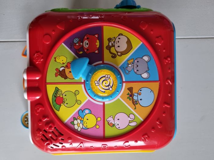 En parfait état, acheté 39,90 € Maison non-fumeur et sans animaux. De 9 à 36 mois, un cube multi-activités parlant et musical, avec 5 faces de jeu dont 2 faces électroniques Un livre interactif avec une page à tourner permet d'écouter des chansons amusantes. Bébé découvre les chiffres, les couleurs, les animaux et écoute des mélodies grce aux 5 touches de piano lumineuses. Il déclenche des chansons lorsqu'il appuie sur le petit ours. Bébé développe sa motricité grace à l'aiguille à faire tourner sur le cadran pour découvrir les animaux et des objets associés, un trieur de formes avec 4 blocs colorés inclus, des formes, des engrenages et des animaux mobiles à manipuler INCLUS : 10 mélodies et 4 chansons. Réglage du volume sonore et arrêt automatique pour préserver la durée de vie des piles. Fonctionne avec 2 piles.