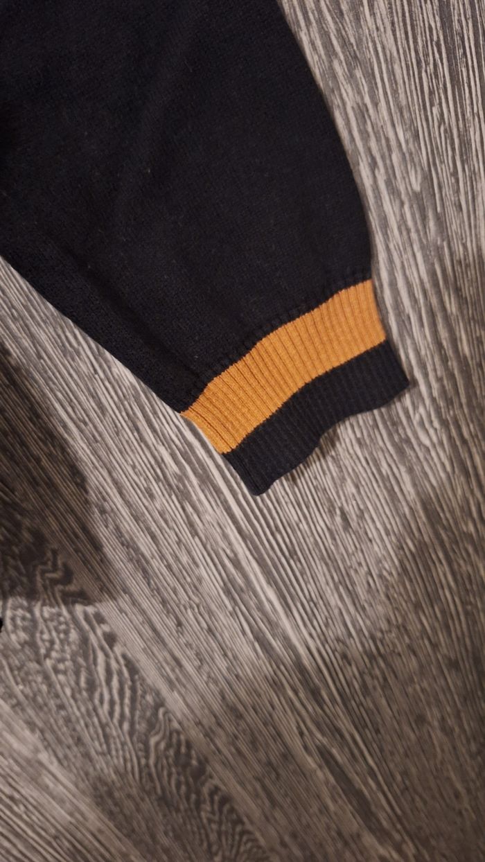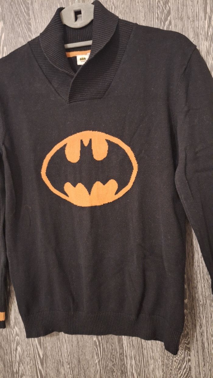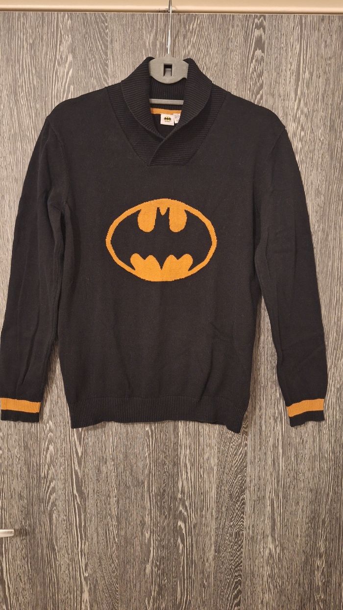 Bonjour ✴️Je vends ce pull en très bon état ✴️De la marque Dc comics Batman ✴️Taille 14ans 164cm ✴️Uni noir avec imprimé logo batman sur le devant orange et noir ainsi que bandes sur les manches orange ✴️Manches longue et col châle pouvant être retroussé ✴️Bord-côtes au niveau de la base et manches extensible ✴️100% coton