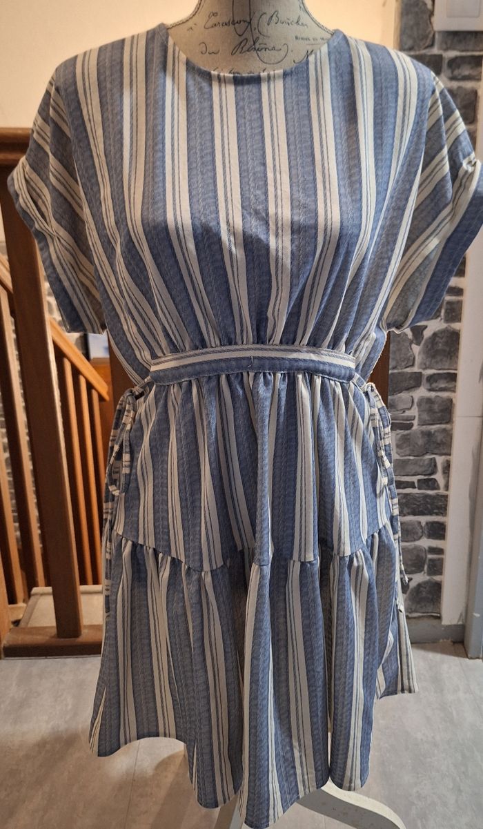 Robe rayée blanche et bleu ciel avec liens à nouer de chaque côté - photo numéro 1