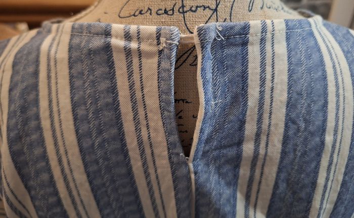 Robe rayée blanche et bleu ciel avec liens à nouer de chaque côté