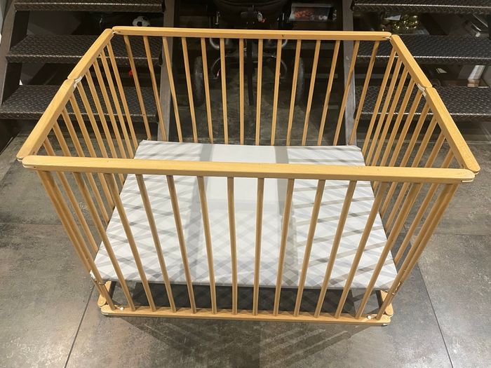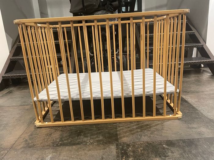 Parc enfant 3 niveaux gris et bois Bon état Taille environ 102cm par 73.5