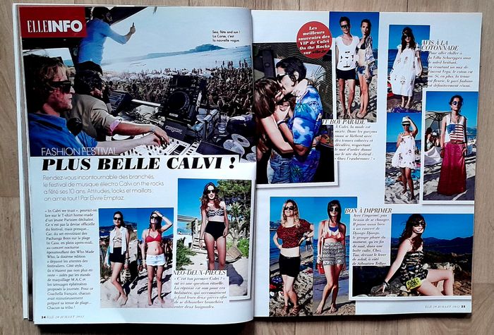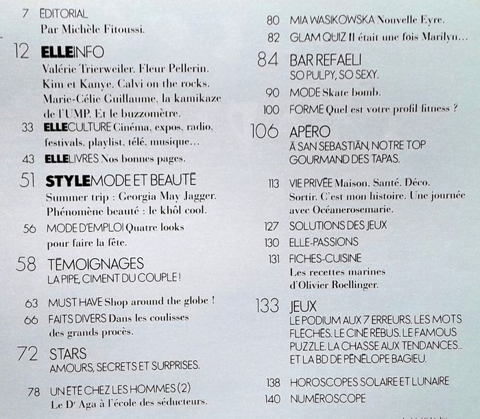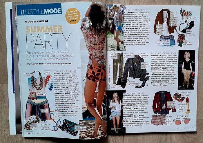 140 pages 28x22cm spécial fleur pellerin 2 pages, fashion festival calvi 2 pages, mode d'emploi summer party mode 2 pages, l'été surprise des stars 4 pages, mia wasikowska 2 pages, marilyn monroe 2 pages, bar refaeli mode plage 6 pages, mode skate 10 pages, food trip 6 pages, elle jeux d'été..