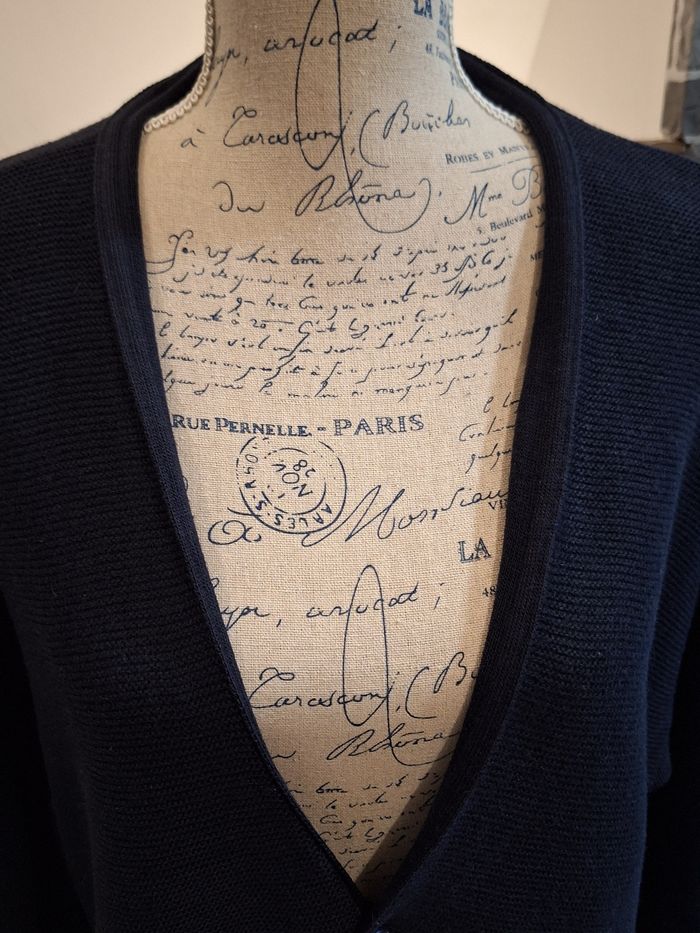 Cardigan bleu marine boutonné avec un col en V. Sans poches. Maille élasthane. Hauteur 72 cm. Taille L.