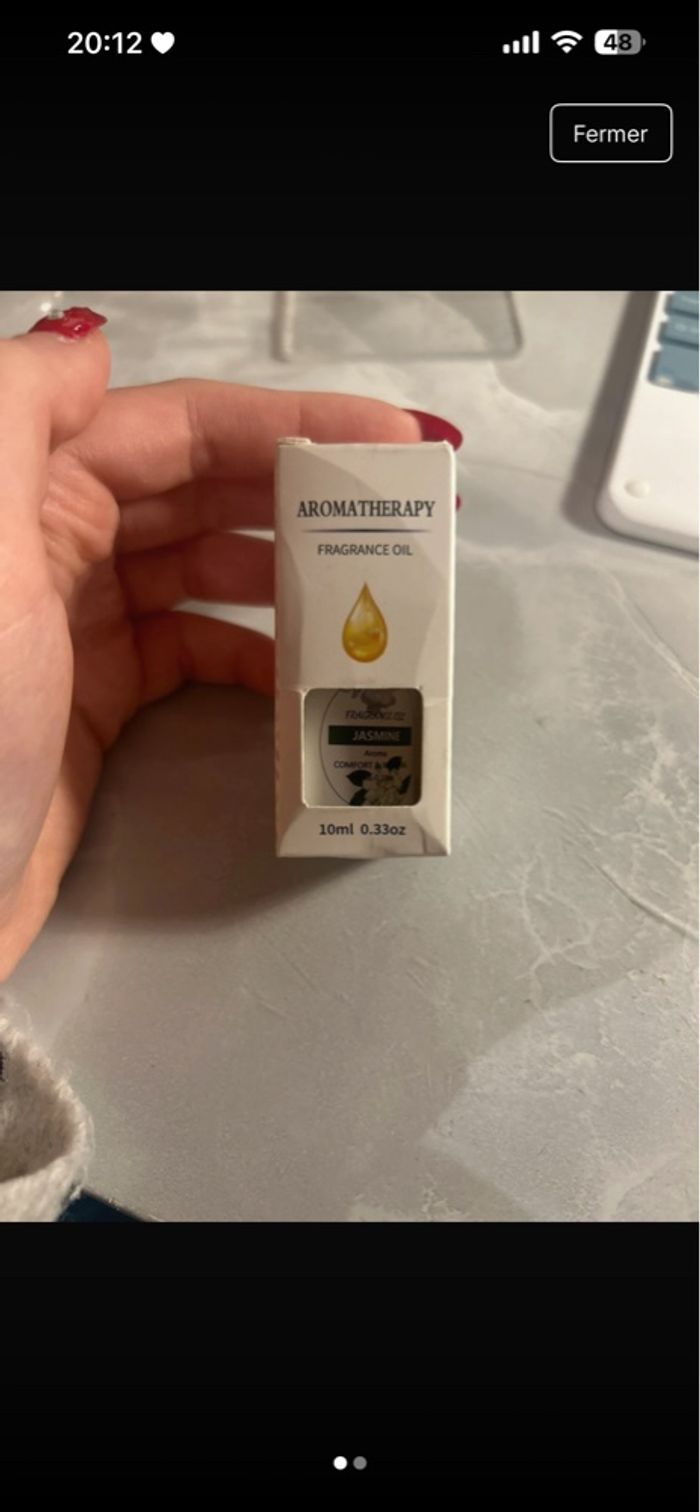Huile essentielle Jasmin de la marque Aromatherapy, neuve avec étiquette. Ouvert seulement pour sentir le parfum, sinon jamais utilisée. Idéal pour la diffusion, la fabrication de bougies, ou vos projets DIY aromatiques. 💰 Prix d’achat : 1,19 €