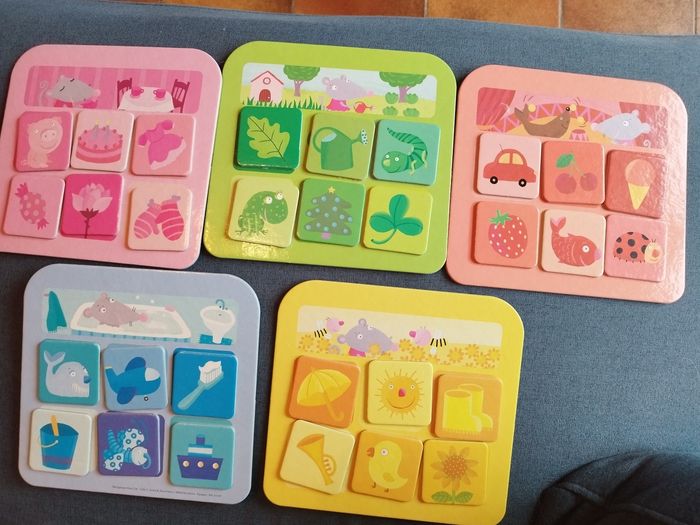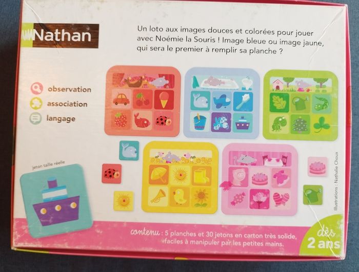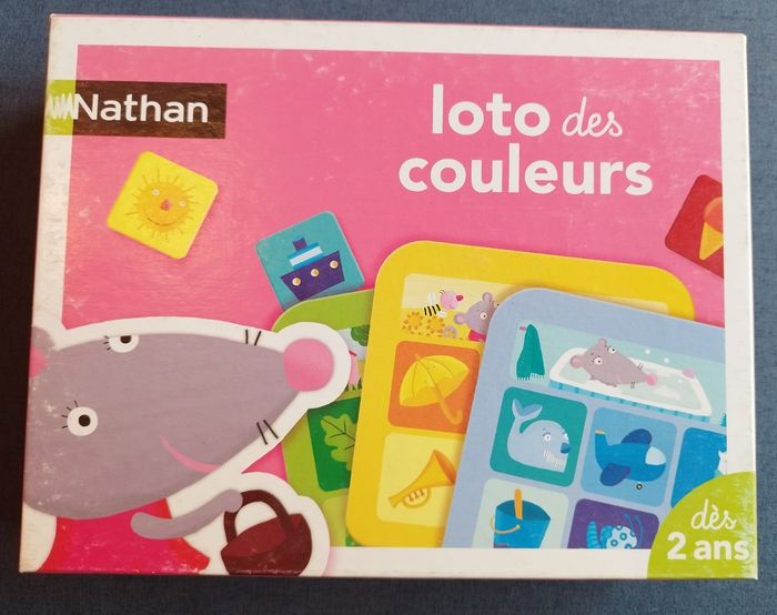 Je vends ce jeu de loto des couleurs de la marque Nathan, un jeu d'éveil pour les enfants de 2 ans. - Type de produit : Jouet d'éveil - Marque : Nathan - Gamme : Loto des couleurs - Âge recommandé : De 0 à 3 ans - Contenu : 5 planches et 30 jetons en carton très solides, faciles à manipuler par les petites mains - Fonctionnalités : Observation, association, langage Très bon état. Boîte un peu marquée cf photo mais jeu en excellent état Un jeu éducatif et amusant pour les tout-petits ! N'hésitez pas à me contacter pour plus d'informations.