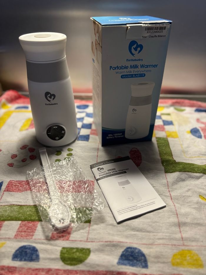 Chauffe biberon portable de la marque Bella baby Contrôle de Température : il réchauffe le lait maternel et l'eau à la bonne température (tout choix de 37 ℃ à 50 ℃ et 4 options rapidement 37 ℃, 40 ℃, 45 °, 50 ℃) pour bébé à chaque fois et tourner automatiquement en mode de température constante pour maintenir la température pendant 30 minutes, empêchant la surchauffe et la préservation de tous les nutriments. Chauffe biberon de Voyage sans fil : portable et compact à mettre dans le sac pour bébé ou en voiture, peut réchauffer le lait maternel, les formules ou l'eau partout pour faire des voyages avec votre bébé un jeu d'enfant. Le réchauffeur d'eau rechargeable a une batterie à haute capacité intégrée pour fournir 6 à 8 heures de longue durée de vie de la batterie et l'interface USB vous permet de la recharger n'importe où. Mélangeur à lait Puissant : 10000 tr / min, le rotor magnétique tourne par la force électromagnétique pour remuer l'eau rapidement afin que l'eau et le lait en poudre puissent être fusionnés uniformément, sans plus de bulles d'air ni d'agglutins. Il peut également mélanger tout en réchauffant le lait maternel pour un chauffage uniforme. Chauffage et étanche: le réchauffement du lait pour les voyages est fait de matériaux de qualité alimentaire, ne garantissant aucune odeur ni substances nocives. Conception à l'épreuve des fuites, sans adaptateur et limite de marque de bouteille, compatible avec tous les besoins d'alimentation pour bébé, ce qui en fait un choix fiable et non intrusif pour les parents en déplacement. Facile à Nettoyer et à Utiliser: avec un coins sans coins à 10 oz en acier inoxydable intérieur, le réchauffeur de lait maternel portable Bellababy peut être facilement nettoyé par rinçage et essuyage. Avec une tige magnétique pour éliminer le mélangeur pour le nettoyage. Il est convivial, simplement chaud et mélanger la formule dans le chaud, et vous pouvez nourrir votre bébé avec des tracas de lait chaud sans tracas. Comme neuf utilisé deux fois car on m’a offert le chauffe biberon d’une autre marque pour mes déplacements.