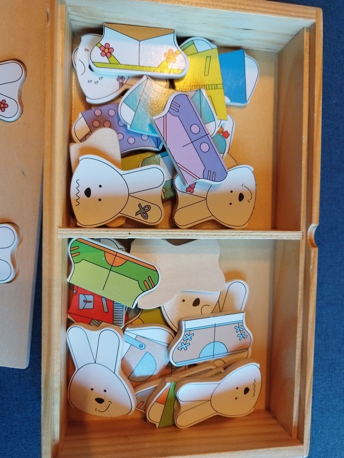 Je vends ce jeu en bois où il faut reconstruire des lapins (tête, corps, bas) - Type de produit : Jouets en bois - Âge recommandé : De 0 à 3 ans - Pièces incluses : différents éléments à composer Marque : Verbaudet Très bon état. Un jeu éducatif et amusant pour les tout-petits ! N'hésitez pas à me contacter pour plus d'informations.