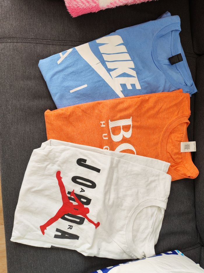 T-shirt x3 1 nike 1 Hugo boss 1 jordan Bien entendu se ne sont pas des vrais Prix pour les 3 Taille a vérifier