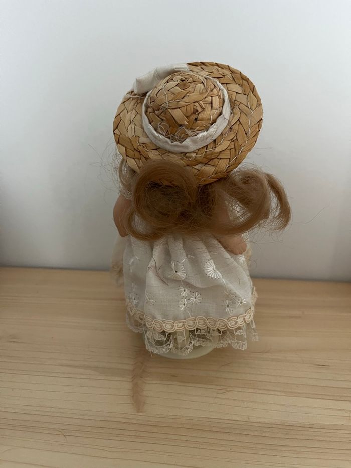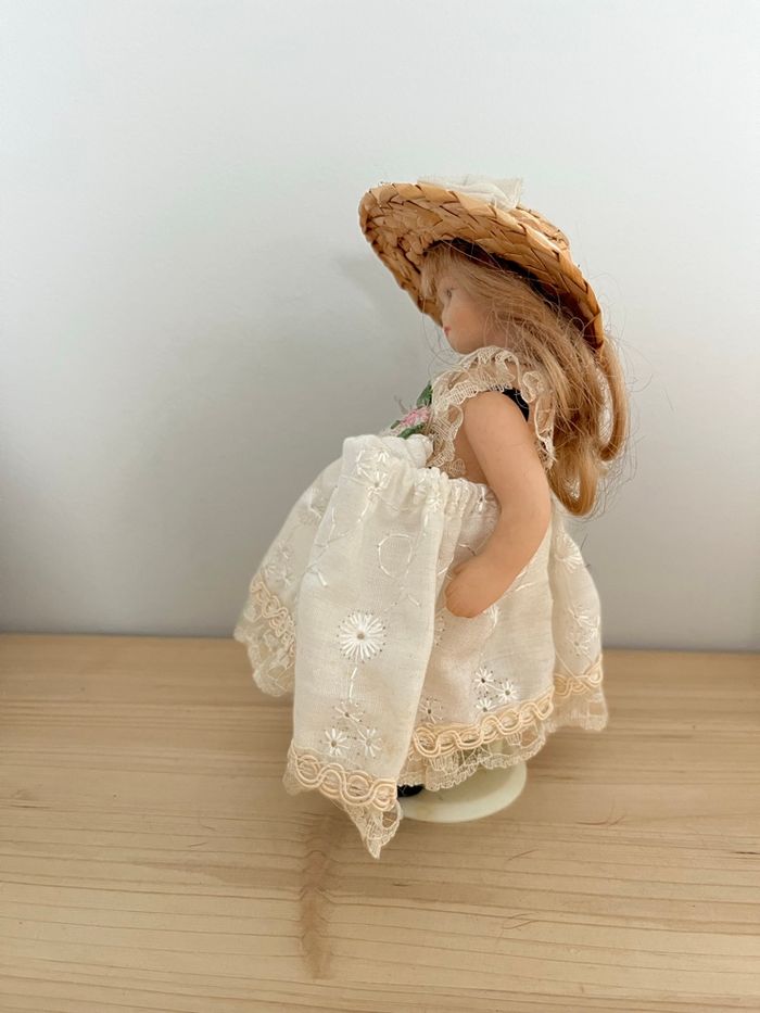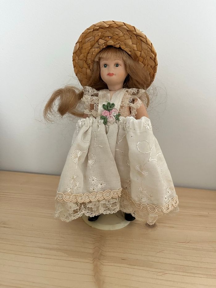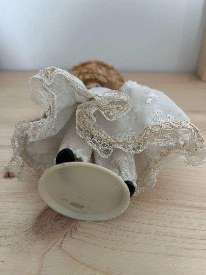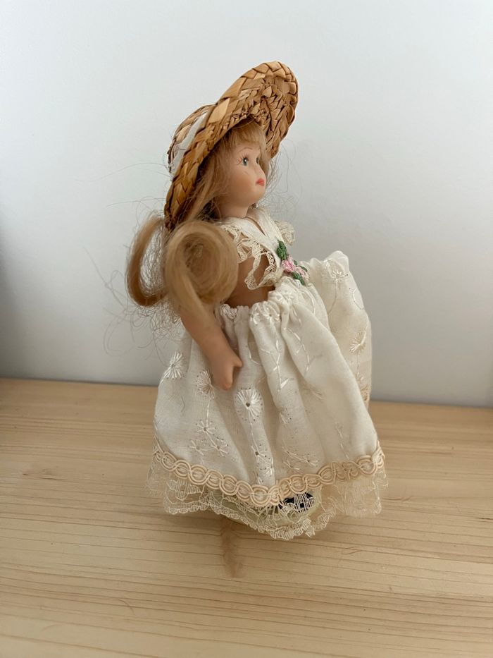 Je vends cette charmante poupée de collection, avec son élégante robe blanche ornée de dentelle et de fleurs. - Type de produit : Poupée de collection - Accessoires : Robe blanche avec dentelle et fleurs, l’élastique au niveau de la taille est cassé (voir photos) - La tête, les bras et les jambes peuvent bouger - Dimensions : environ 15 x 5,5 cm Bon état N'hésitez pas à me contacter pour plus d'informations ou de photos. Envoie rapide et soigné