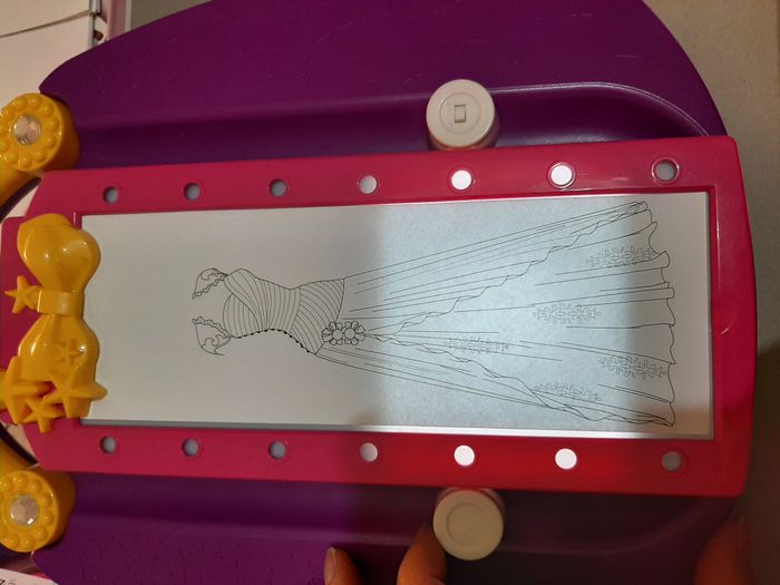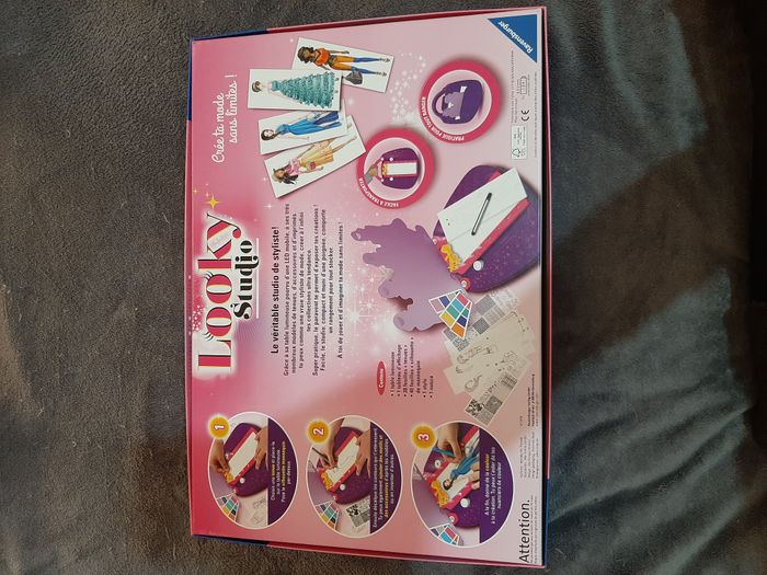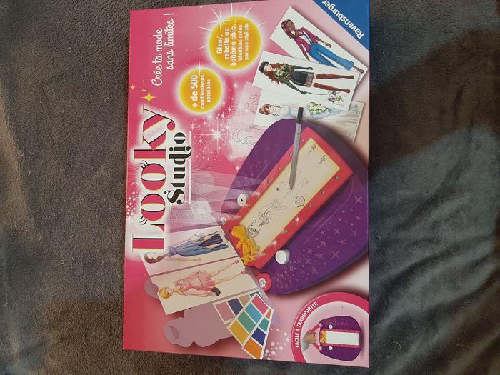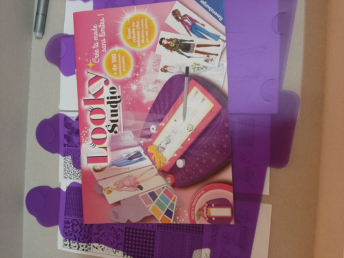 Manque quelques feuilles, le reste en très bon état. Marque : Ravensburger Age : 6ans Dimension : 49 x 35 x 10 cm Contenu : 1 table lumineuse 1 grand panneau-paravent Des feuilles "tenues" Des feuilles "silhouettes" 1 feutre noir fin 1 notice en couleurs avec plein d’astuces Un studio de styliste de mode pour créer ses modèles sans limites ! Un nouveau Looky studio qui permet toujours à l’enfant de dessiner et d’imaginer ses modèles sans limites, dans un univers de studio graphique très proche de celui d’une styliste de mode.