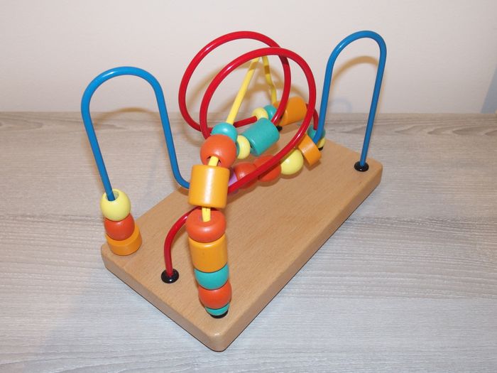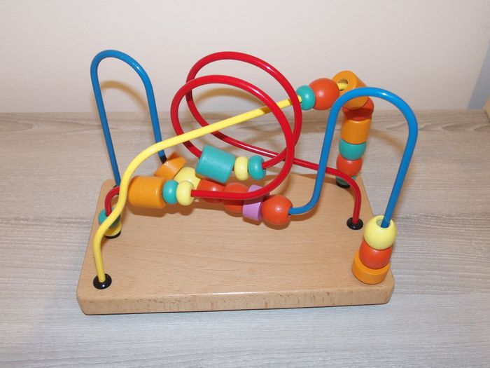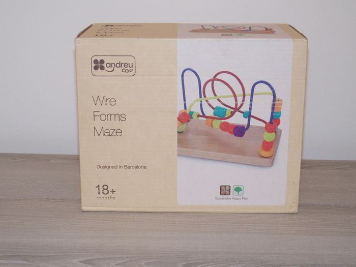 Labyrinthe de perles / boulier en bois de la marque Andreu Toys. Très costaud. Ventouse pour le positionner sur une surface et qu'il ne bouge pas lorsque bébé joue avec. Quelques marques d'usures visible en photos mais en très bon état : rien de cassé, fonctionne correctement. Encore dans sa boite d'origine.
