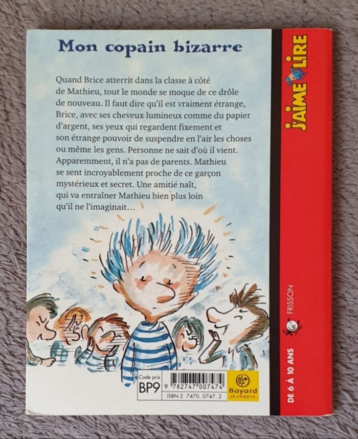 Résumé : Quand Brice atterrit dans la classe à côté de Mathieu, tout le monde se moque de ce drôle de nouveau. Il faut dire qu'il est vraiment étrange, Brice, avec ses cheveux lumineux comme du papier d'argent, ses yeux qui regardent fixement et son étrange pouvoir de suspendre en l'air les choses ou même les gens. Personne ne sait d'où il vient. Apparemment, il n'a pas de parents. Mathieu se sent incroyablement proche de ce garçon mystérieux et secret. Une amitié naît, qui va entraîner Mathieu bien plus loin qu'il ne l'imaginait... Date de parution : 29/11/2011. Auteur : Jean Guilloré. Illustrateur : Serge Bloch. Collection : J'aime Lire - Série frisson. Éditions : Bayard Jeunesse. Dimensions du livre : 14.5x0.6x19Cm. =) 42 pages. Montant d'achat magasin : 6.20E. En très bon état général!