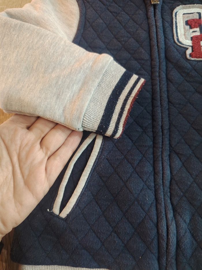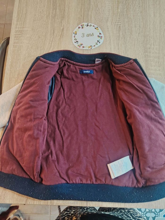 Veste Teddy en taille 3 ans de la marque okaidi. Elle a été portée mais reste en très bon état général. Le bleu est moins intense il a légèrement blanchi suite aux lavages.