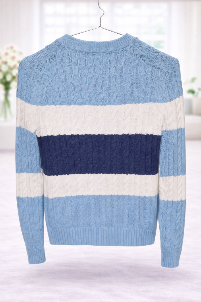 👕 Pull Tommy Hilfiger torsadé bleu – Taille XS – 100 % coton Pull Tommy Hilfiger original en maille torsadée, style intemporel et élégant. Joli jeu de rayures bleu ciel, blanc et bleu marine, très facile à associer. ✔️ 100 % coton : respirant, confortable et agréable à porter ✔️ Maille torsadée de qualité ✔️ Coupe ajustée, idéale pour un look chic & casual ✔️ Finitions soignées, logo discret sur la manche ✔️ Parfait en toute saison (printemps / automne / hiver en superposition) 👤 Pour : Femme 📏 Taille : XS 📐 Mesures à plat : - Largeur aisselle à aisselle : 46 cm - Longueur totale : 62 cm