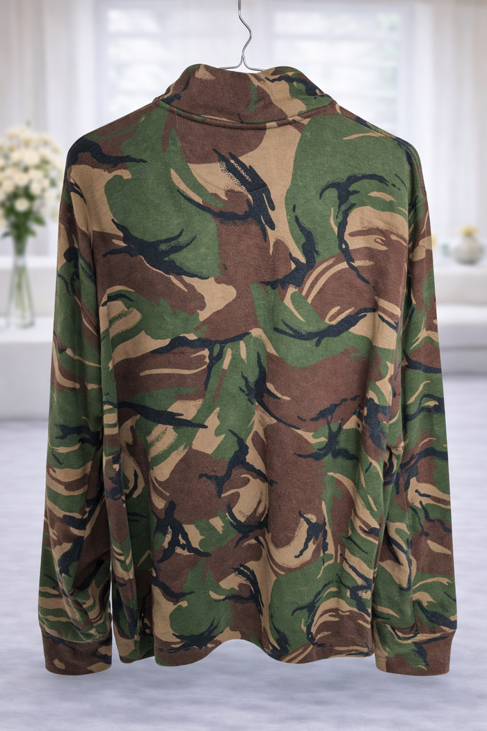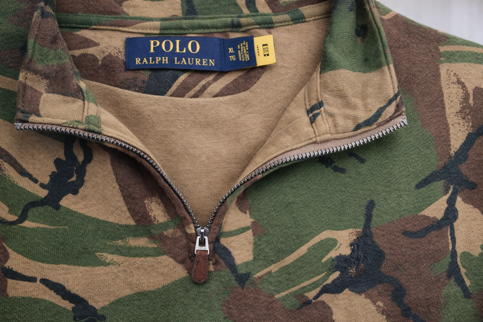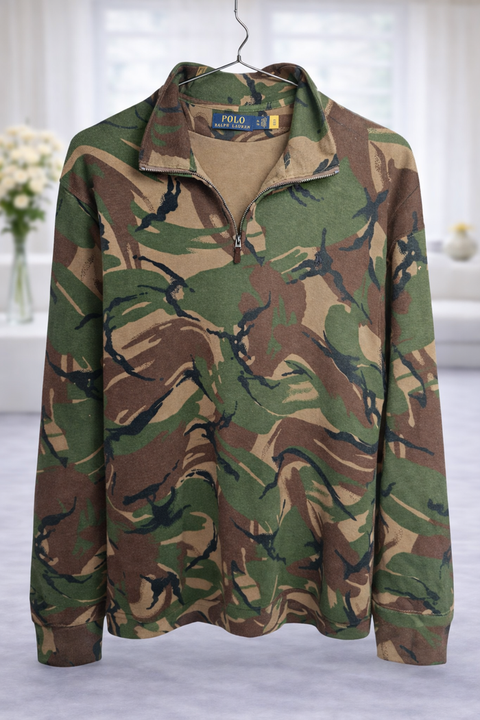 🪖 Pull zippé camouflage – Polo Ralph Lauren – Homme – Taille XL Magnifique pull zippé Polo Ralph Lauren original, au motif camouflage militaire (vert, marron et beige) au rendu authentique et tendance. Pièce forte au style casual chic, facile à associer avec un jean ou un pantalon cargo. ✔️ 100 % coton de haute qualité, confortable et respirant ✔️ Col zippé pratique et élégant ✔️ Logo brodé discret sur la poitrine ✔️ Coupe droite, agréable à porter ✔️ Finitions soignées, rendu premium 👤 Pour : Homme 📏 Taille : XL 📐 Mesures à plat : - Largeur aisselle à aisselle : 70 cm - Longueur totale : 81 cm