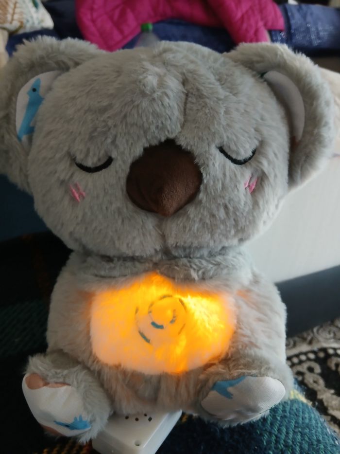 Koala anti anxiété pour enfant ou adulte. 2 possibilités soit le mode bruit soit le mode bruit et veilleuse. Le ventre se soulève a chaque inspiration et on entend la respiration du koala.