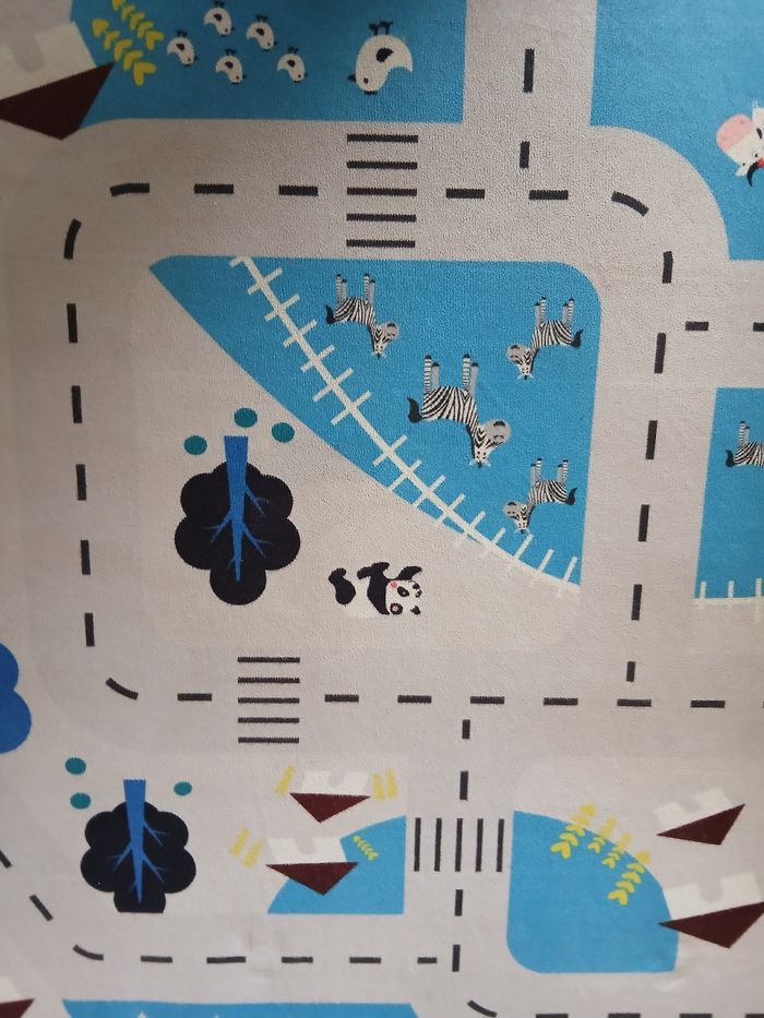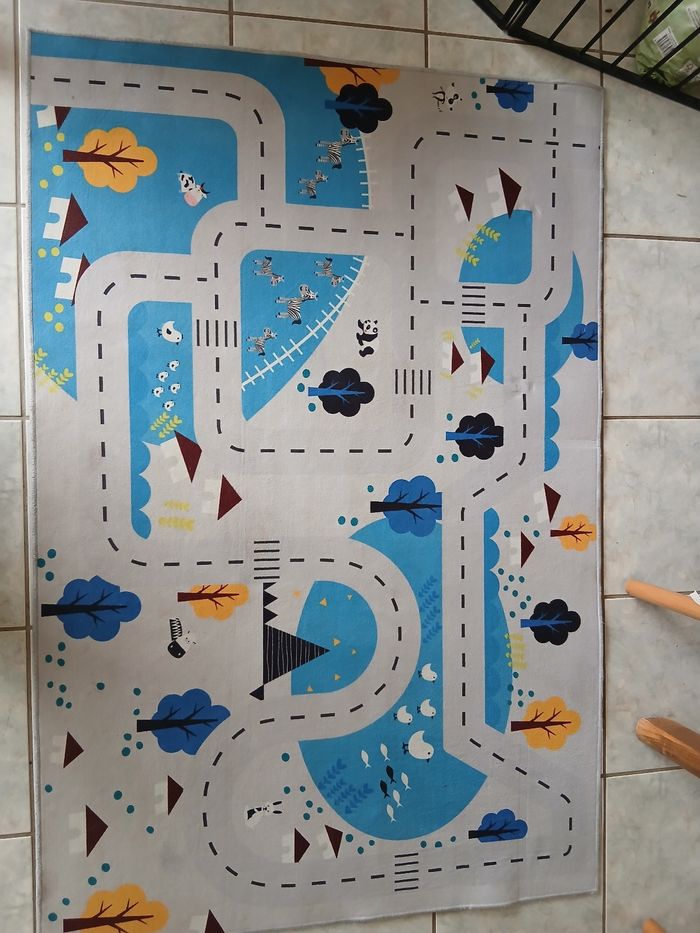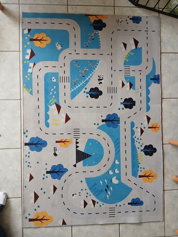 Tres joli tapis poils courts dans les couleurs gris, bleu et turquoise. Représente un circuit a travers divers zones avec animaux. État neuf Dimension 100x130