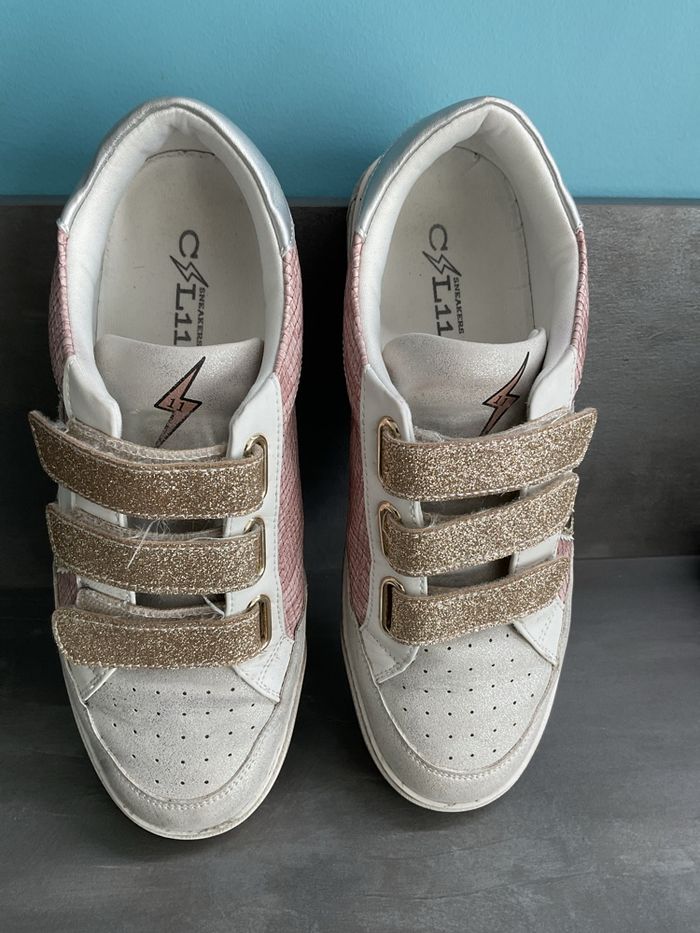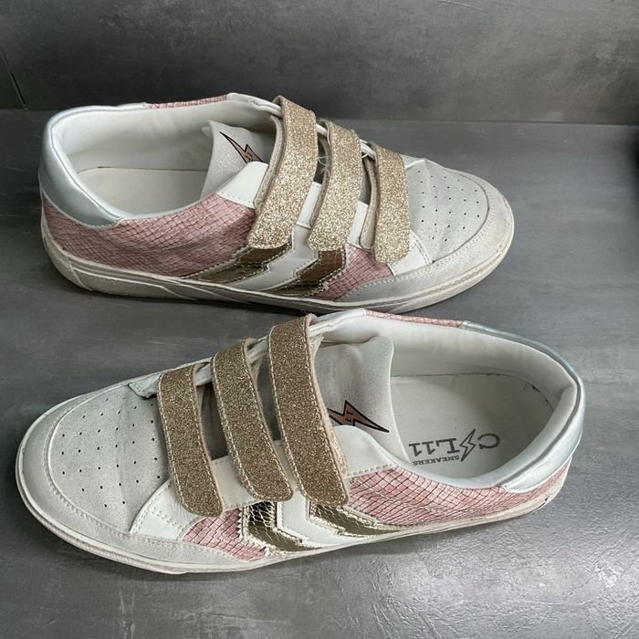Baskets à scratch femme. Pointure 39. Assez large. Très peu portées. Très bon état. Couleur dorée rose.