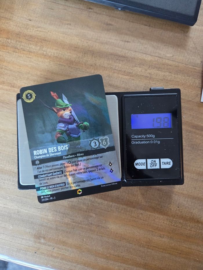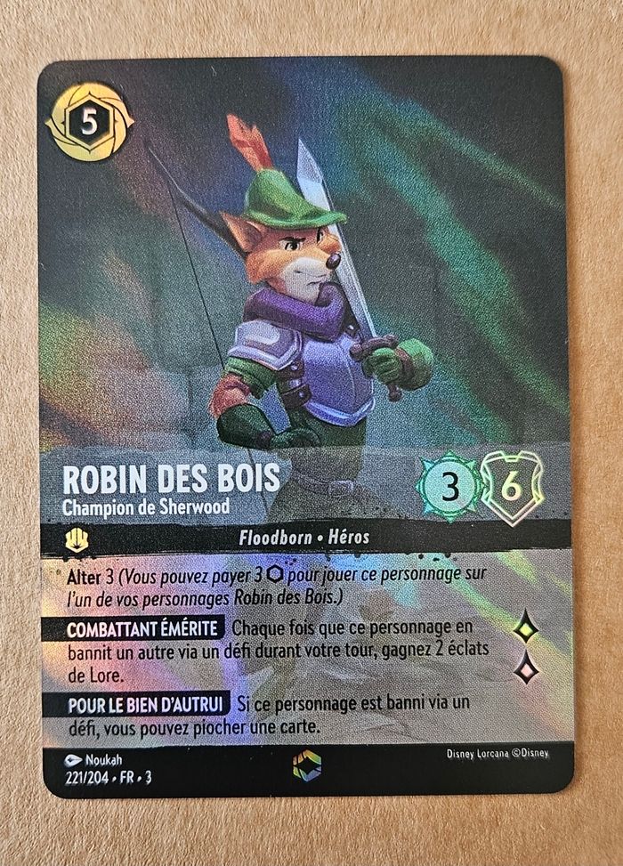 Vends carte Lorcana Chapitre 3 Robin des bois Champion de Sherwood . Carte enchantée n°221/204 État NM, envoi rapide et soigné