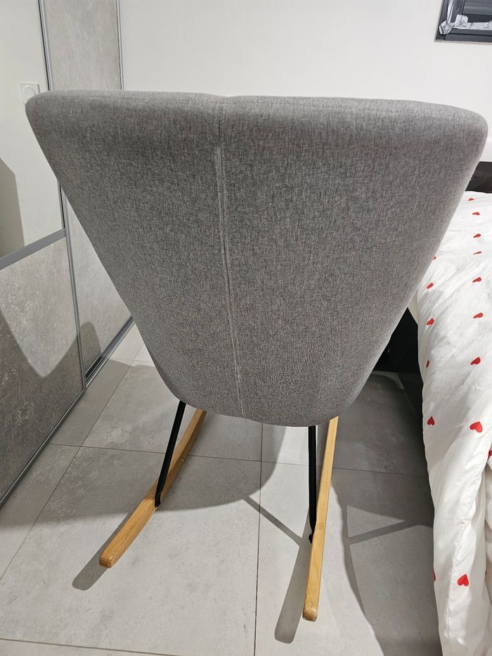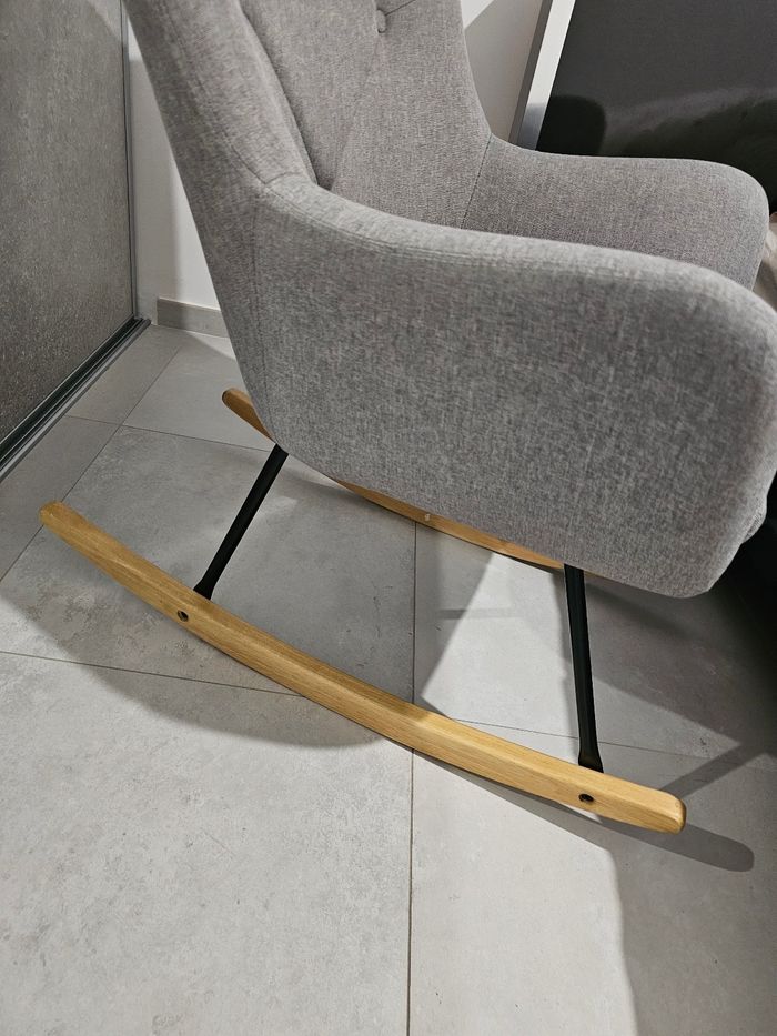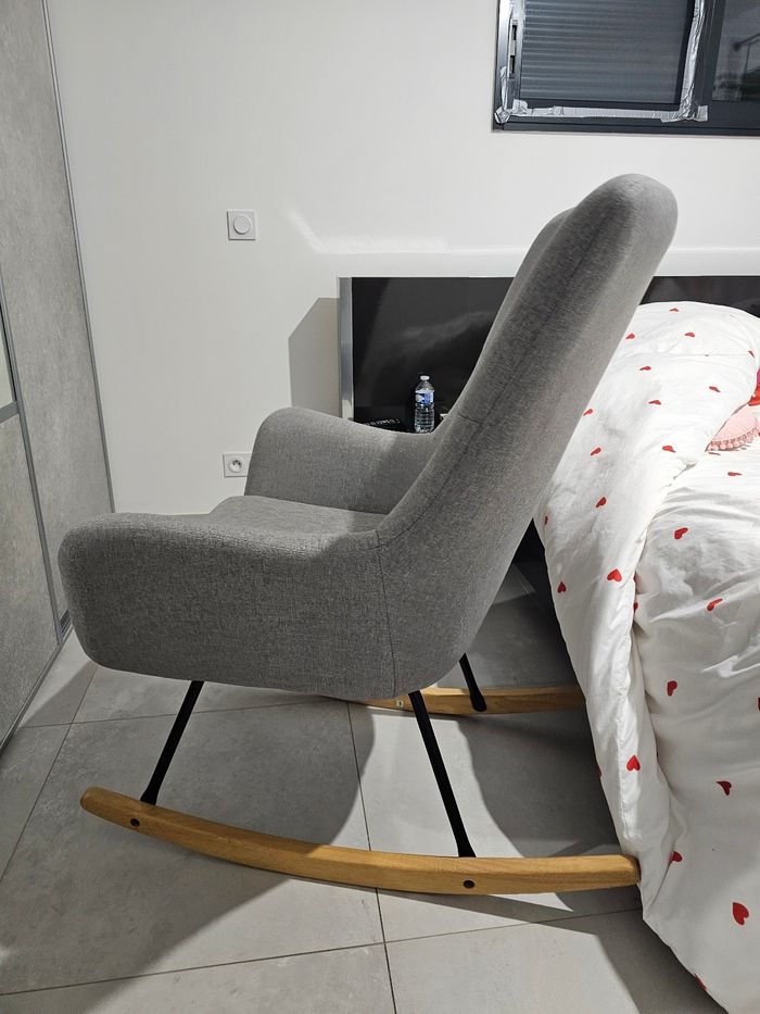 Joli Fauteuil à bascule Très confort Utilisé pour l'allaitement mais aussi pour la lecture des histoires (très large donc avec 2 enfants sur les genoux confort toujours ok) La bascule est très fluide et agréable Pas de défaut Dehoussable Maison non fumeur L'envoie me semble complicado mais on peut voir ensemble.