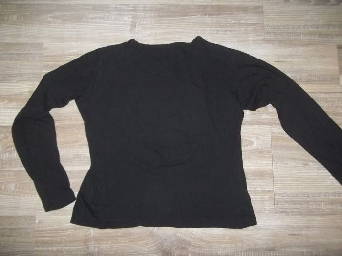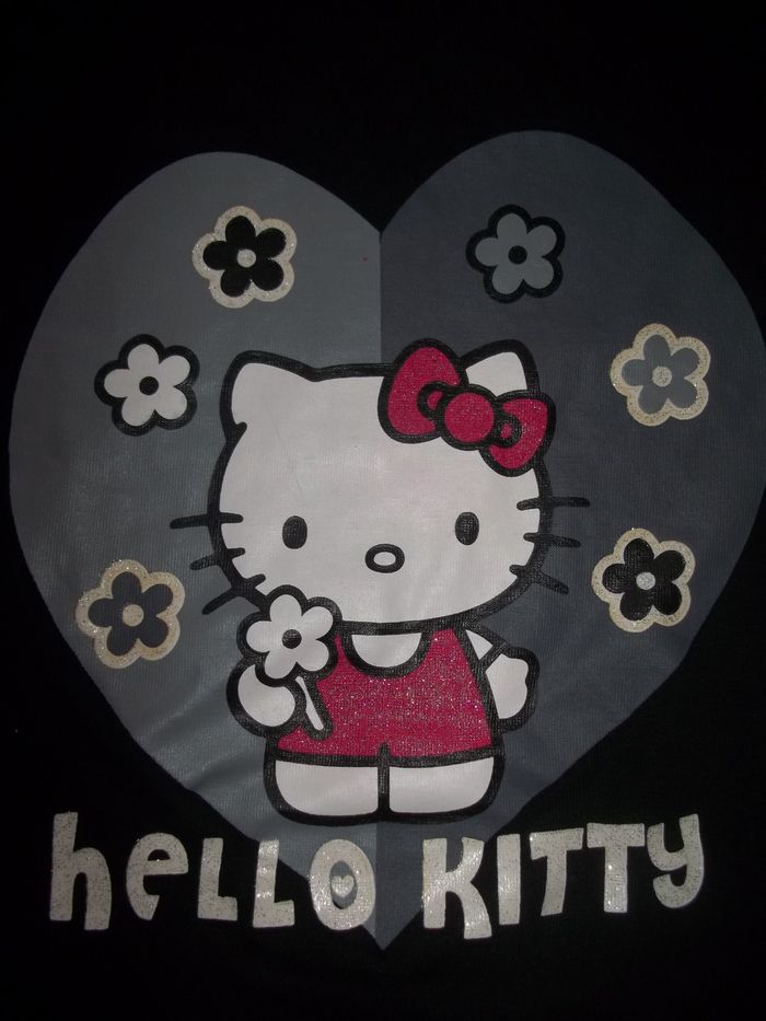 Tee-shirt à manches longues et col rond, 100 % coton, noir. Sérigraphie gros coeur 2 gris avec fleurs et Hello Kitty "Hello Kitty" en blanc, le blanc et le rose sont un peu scintillants. Noté 10 ans (140 cm) mais court pour du 10 ans. Longueur 41 cm, manches 44 cm, largeur épaules 32 cm, aisselles 35 cm, poignets 9/10 cm.