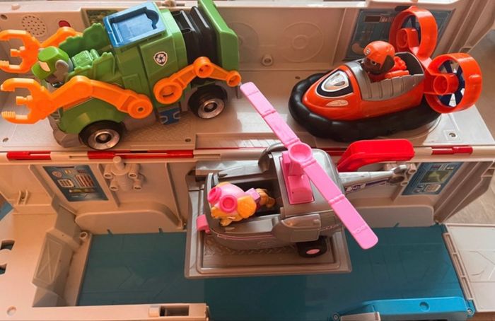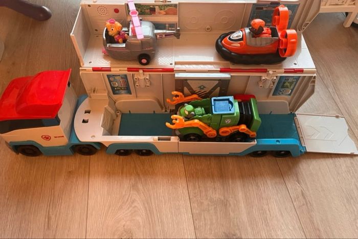 Camion pat patrouilleur de la Pat patrouille avec effets sonores Peut accueillir 3 véhicules une fois fermé Environ 70cm de long En bon etat Vendu avec Stella, Zuma et Rocky et leurs véhicules respectifs Je donne en plus le quad de Ryder (mais plus le personnage) et un 2e Zuma Si besoin j'ai encore le carton du camion