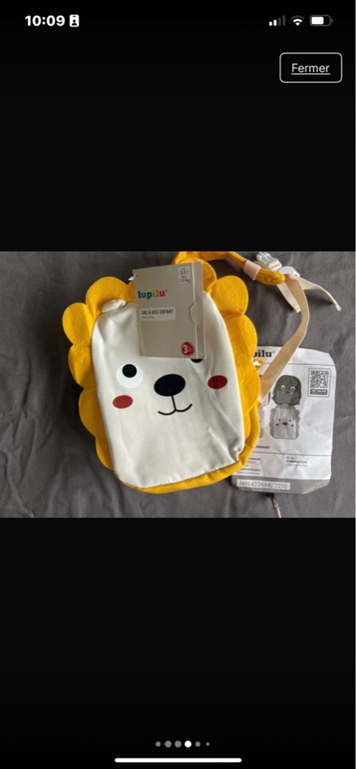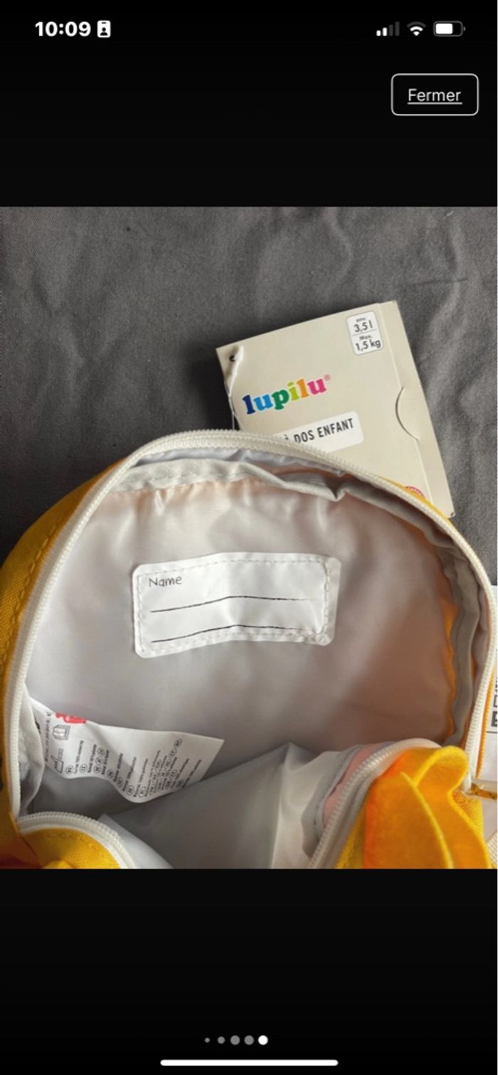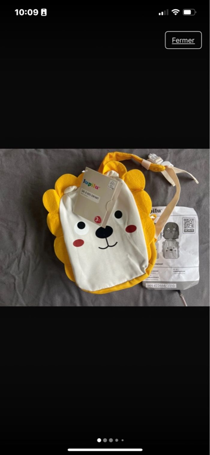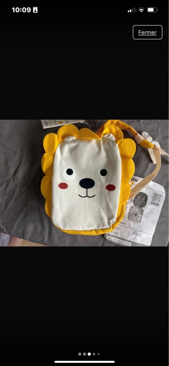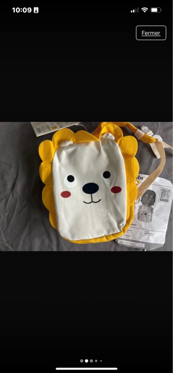 Petit sac à dos de couleur jaune moutarde en forme de lion pour enfant, idéal maternell pour le gouter, les sorties ou pour l'école étiquette pour inscrire le nom NEUF