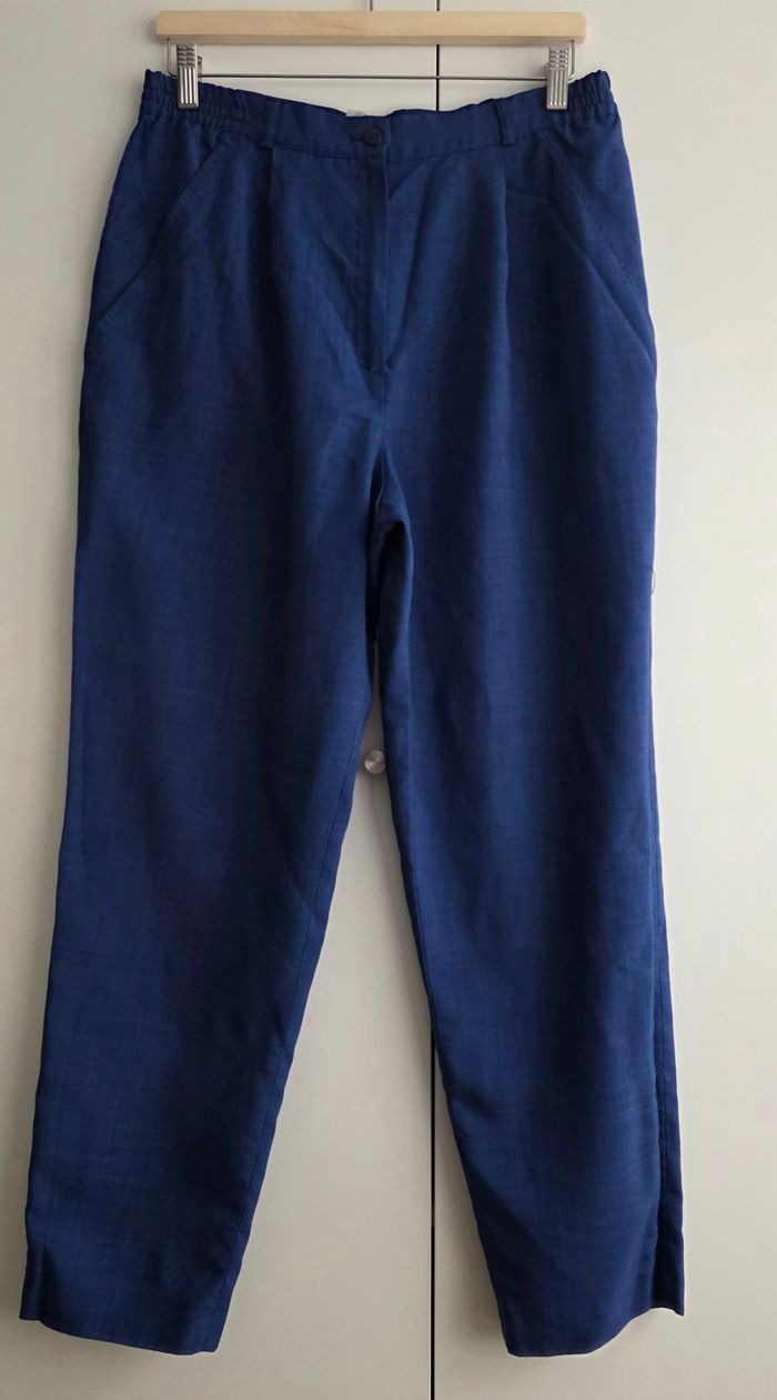 Pantalon de marque Lineav, taille 40. Couleur bleu, 2 poches, passant pour ceinture. Mesure taille: 39cm Entrejambe: 73cm Longueur: 104cm