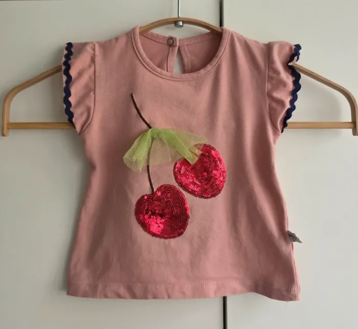 T-shirt de marque Cim & Cim, manches courtes, taille 9 mois, 80% coton, 20% polyester. Couleur rose, motif en sequin déco. 1 bouton pression au dos.