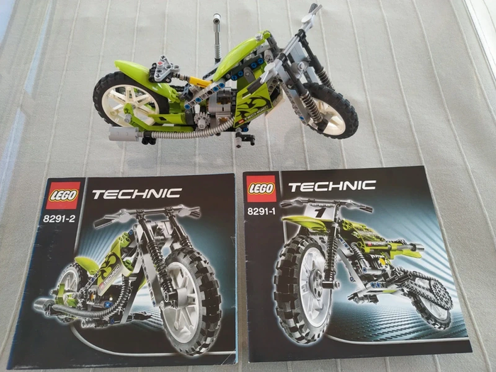 Lego Technic 8291 Moto complet Avec ces deux notices de cross et trial Montée actuellement en mode chopper avec commande levier de vitesse. Une page de notice se détache mais bien présente et complète. Envoi soigné.