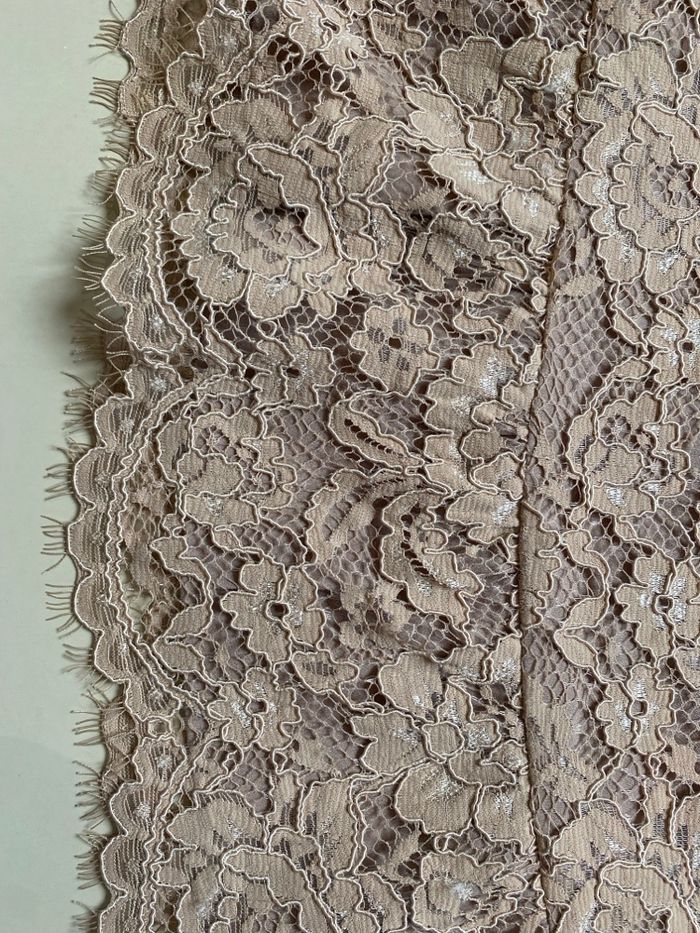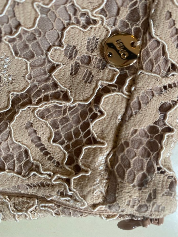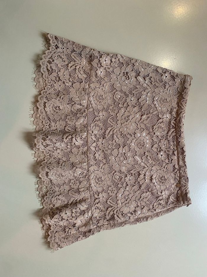 Jupe courte dentelle Liu Jo, haut de gamme, couleur poudre, taille 40, neuve. Légèrement évasée, la longueur est de 45 cm, la largeur du volant est de 69 cm. Sur l'étiquette d'entretien il est noté taille 44, c'est la taille italienne qui correspond à un 40 français.