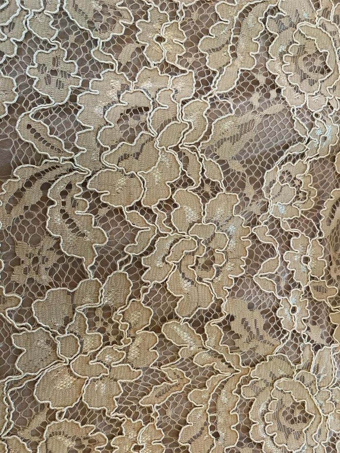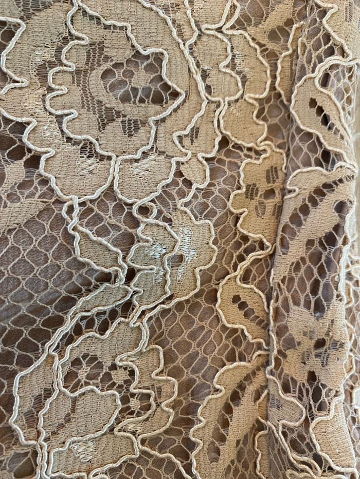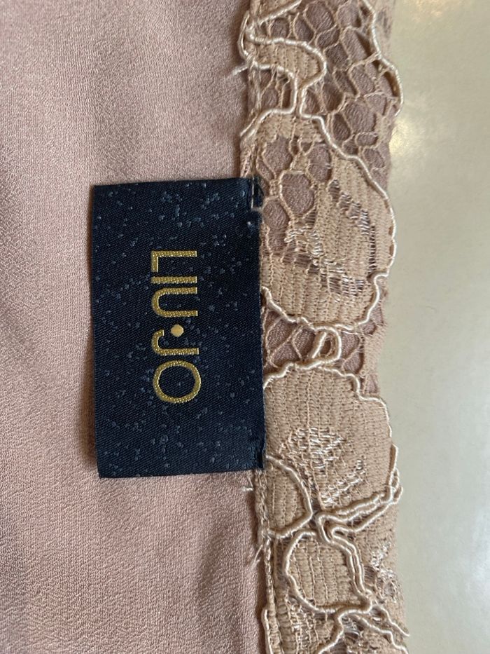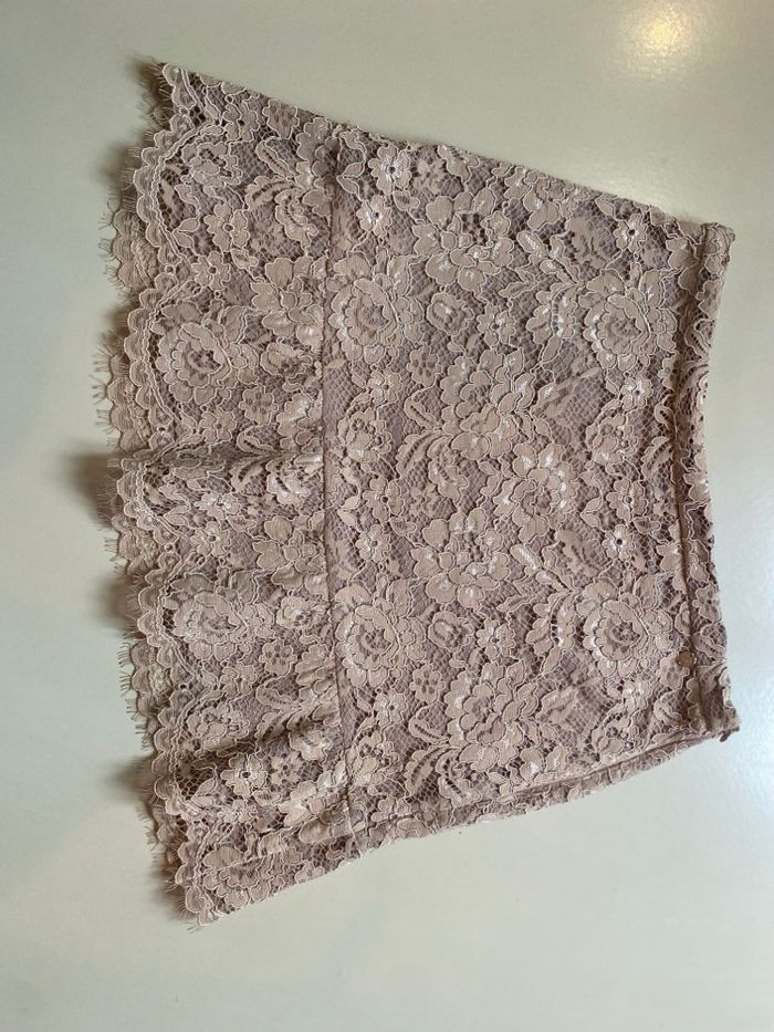 Jupe courte dentelle Liu Jo, haut de gamme, couleur poudre, taille 40, neuve. Légèrement évasée, la longueur est de 45 cm, la largeur du volant est de 69 cm. Sur l'étiquette d'entretien il est noté taille 44, c'est la taille italienne qui correspond à un 40 français.