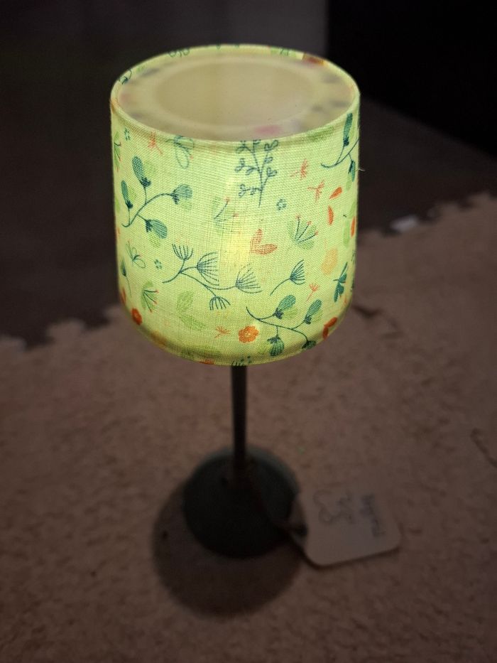 Dans la catégorie des adorables miniatures Maileg, voici la pièce indispensable qui nous manquait pour apporter encore plus de chaleur chez nos petites souris et lapins! Cette superbe mini lampe sur pieds sera indispensable pour illuminer leur intérieur. Ce mini lampadaire Maileg coloris "dark mint" est idéal pour vos maisons de poupées Maileg. Grâce à un petit bouton situé au pied, la lampe s'allume vraiment pour éclairer d'une lumière chaude l'intérieur de vos petites poupées souris Maileg à la tombée du soir. On aime particulièrement le look rétro et son charmant abat-jour fleuri qui complètera parfaitement la décoration du salon ou d'une chambre de lapins ou petites souris Maileg. Interrupteur situé au pied de la lampe. Fonctionne avec une pile "bouton" CR1632 / Phillips (pile remplaçable). Ampoule et pile inclus. Dimensions : hauteur lampe 21 cm - diamètre pied : 6 cm Matières : métal et coton Convient aux enfants à partir de 3
