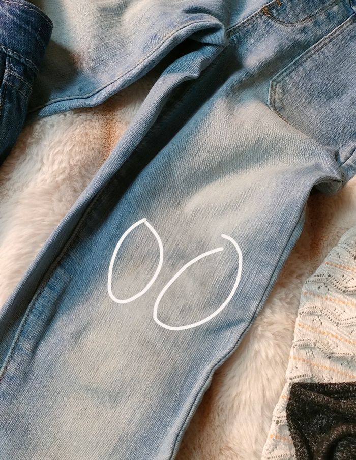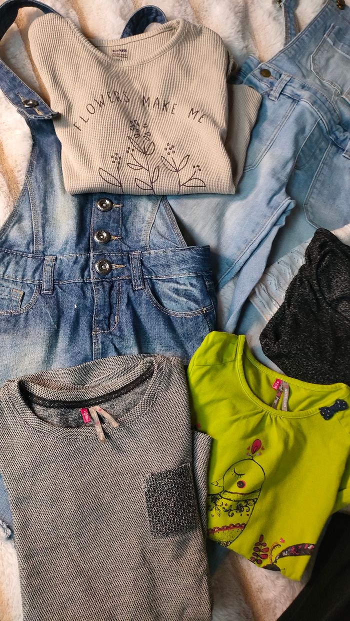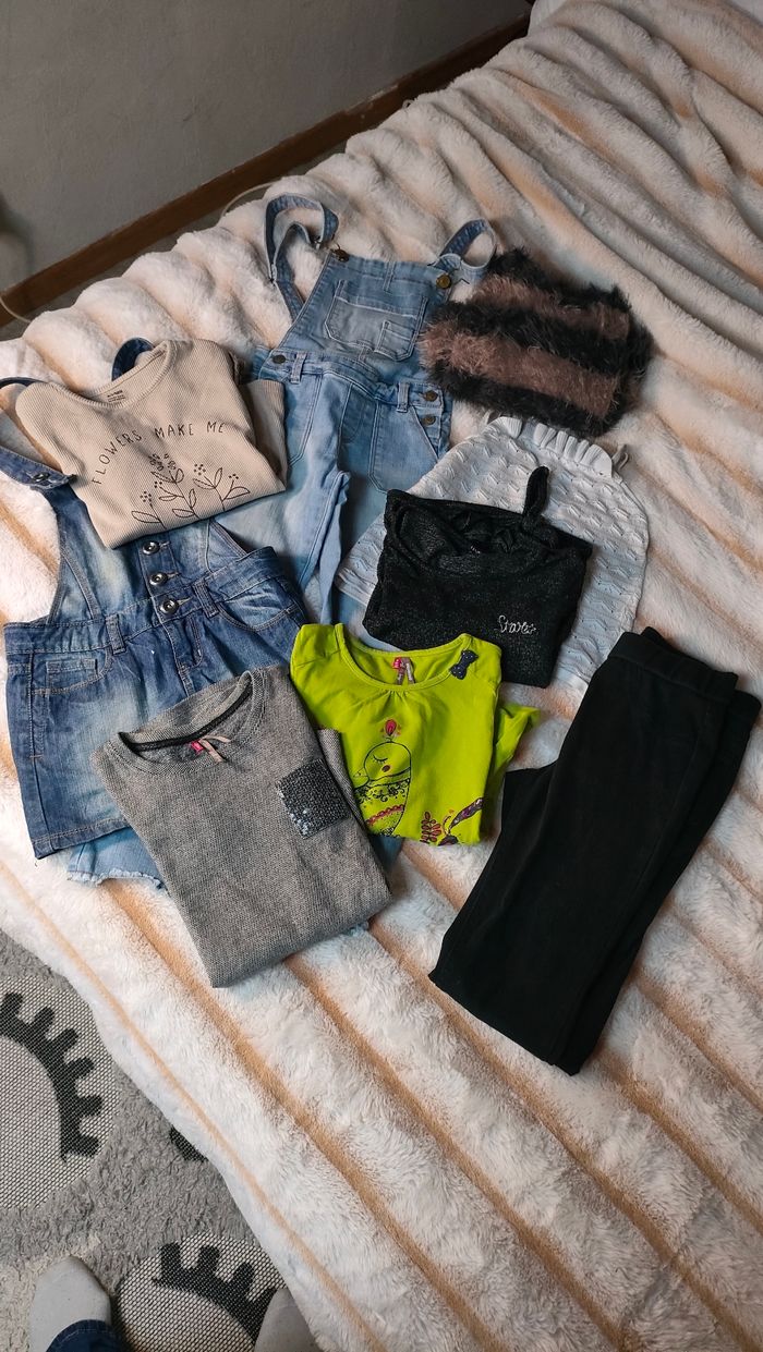 Lot de vêtements fille 8-12 ans. Certains vêtements comportent des tâches que je n'ai pas su avoir. Mais c'est vraiment très léger (voir les photos, j'ai entouré). Le lot contient : - un t-shirt manches longues orchestra 8 ans - une tunique manche courte Orchestra 8 ans - un pull fin Kiabi 8 ans - un débardeur Orchestra 8 ans (tâches au dos) - un pull 8 ans Kiabi - un maillot manches longues 10 ans Kiabi - un jean slim "jegging" (plus fin qu'un jean) La halle, 12 ans (taille petit d'après moi) - une robe salopette en jean, dans 8 ans - une salopette en jean Kiabi 8 ans