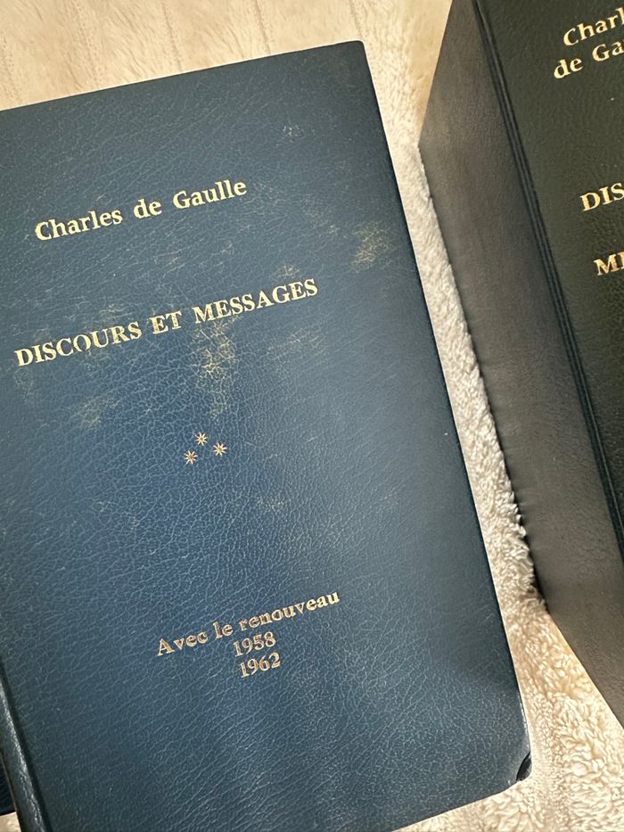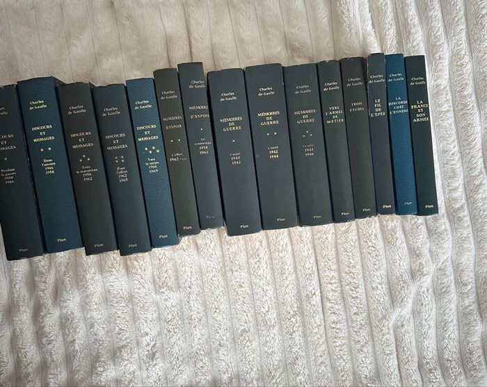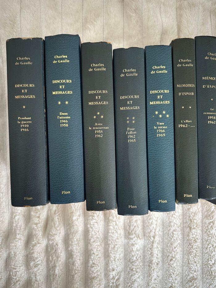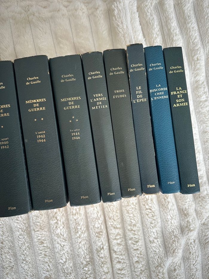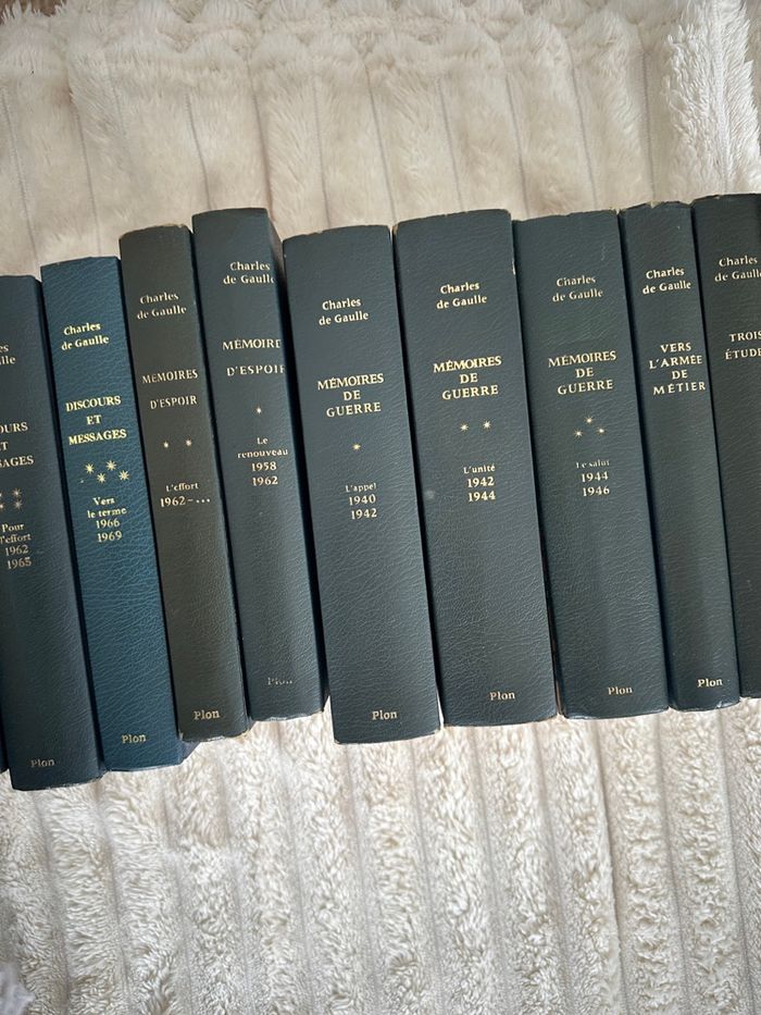 15 livres : Discours et messages : 5 tomes de 1940 à 1969 Mémoires d’espoir : 2 tomes de 1958 à l’après 1962 Mémoires de guerre : 3 tomes de 1940 à 1946 5 livres : Vers l’armée de métier Trois études Le fil de l’épée La discorde chez l’ennemi La France et son armée Collection Plon des années 1970 Il y a certaines couvertures tachées et les pages sont plus ou moins jaunies en fonction des livres Disponible sur Rouen et alentours ou envoi par colis Pas de réduction sur cette annonce.